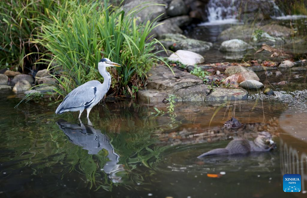 This photo taken on Nov. 9, 2022 shows a grey heron and otter at London Wetland Centre in London, Britain. (Xinhua/Li Ying)