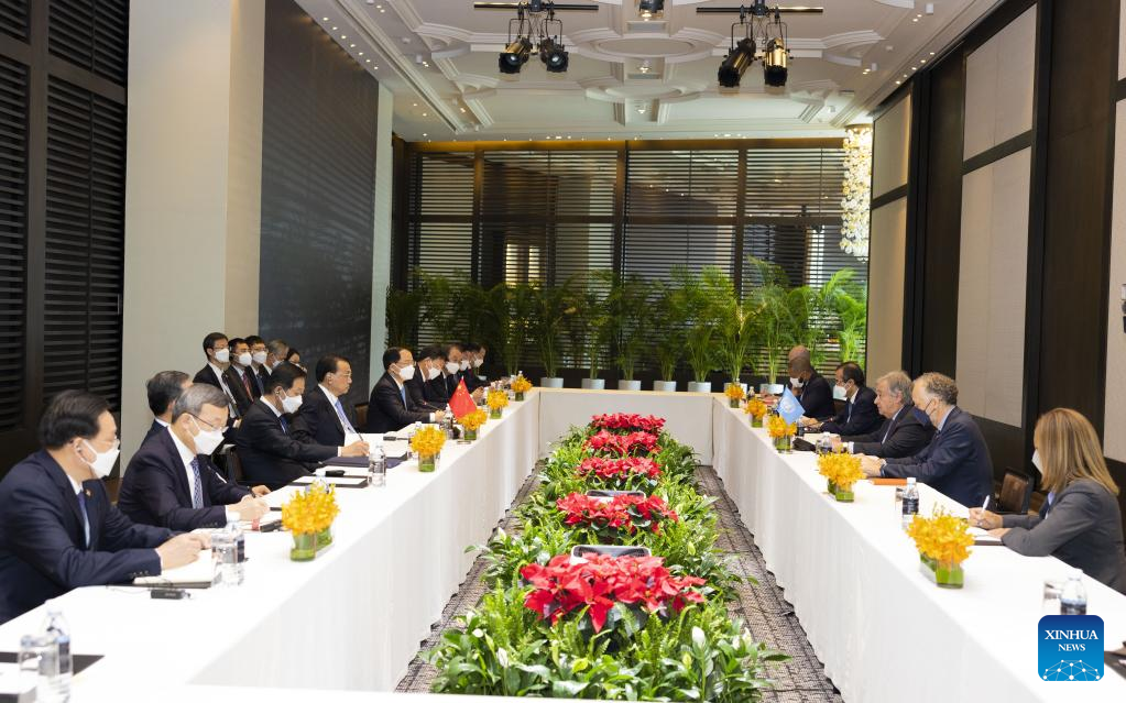 Chinese Premier Li Keqiang meets with United Nations Secretary-General Antonio Guterres in Phnom Penh, Cambodia, Nov. 13, 2022. (Xinhua/Huang Jingwen)