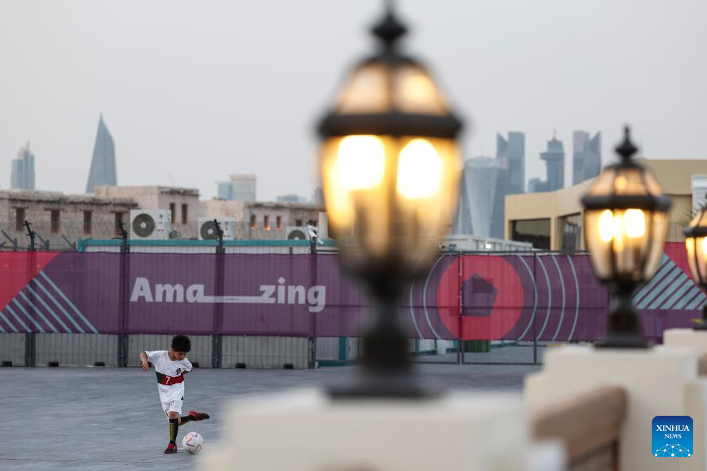 A boy plays football at the Souq Waqif in Doha, Qatar, on Nov. 8, 2022. (Xinhua/Li Ming)