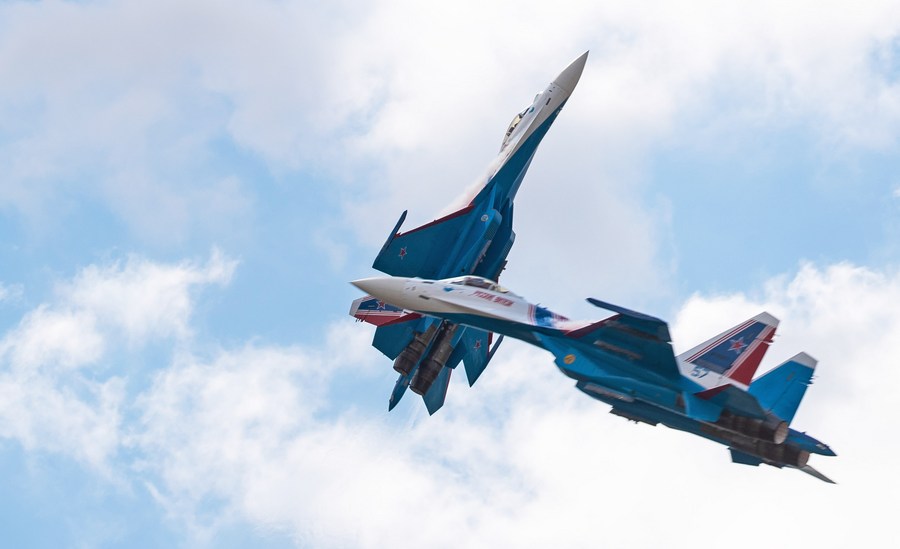 The Russian Knights aerobatic demonstration team perform during the closing day of the International Aviation and Space Salon (MAKS)-2021 in a Moscow suburb, Russia, on July 25, 2021. (Xinhua/Bai Xueqi)