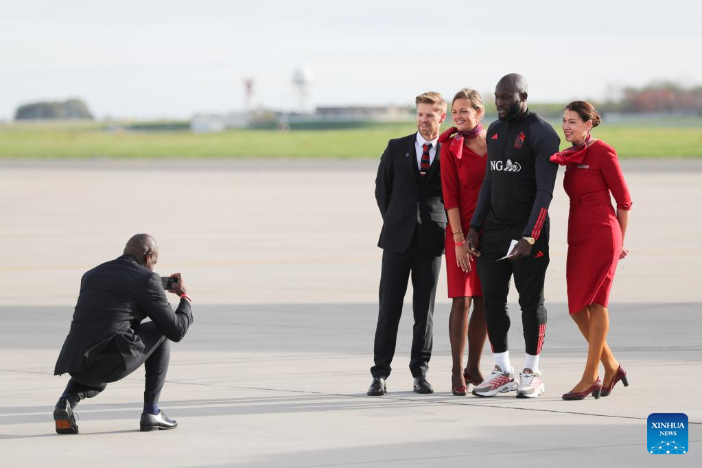 Romelu Lukaku (2nd R) of Team Belgium poses for photos with staff members of Brussels Airlines at the Brussels Airport in Zaventem, Belgium, Nov. 15, 2022. Team Belgium started their journey to the Middle East as they prepare for the upcoming Qatar 2022 World Cup. (Xinhua/Zheng Huansong)