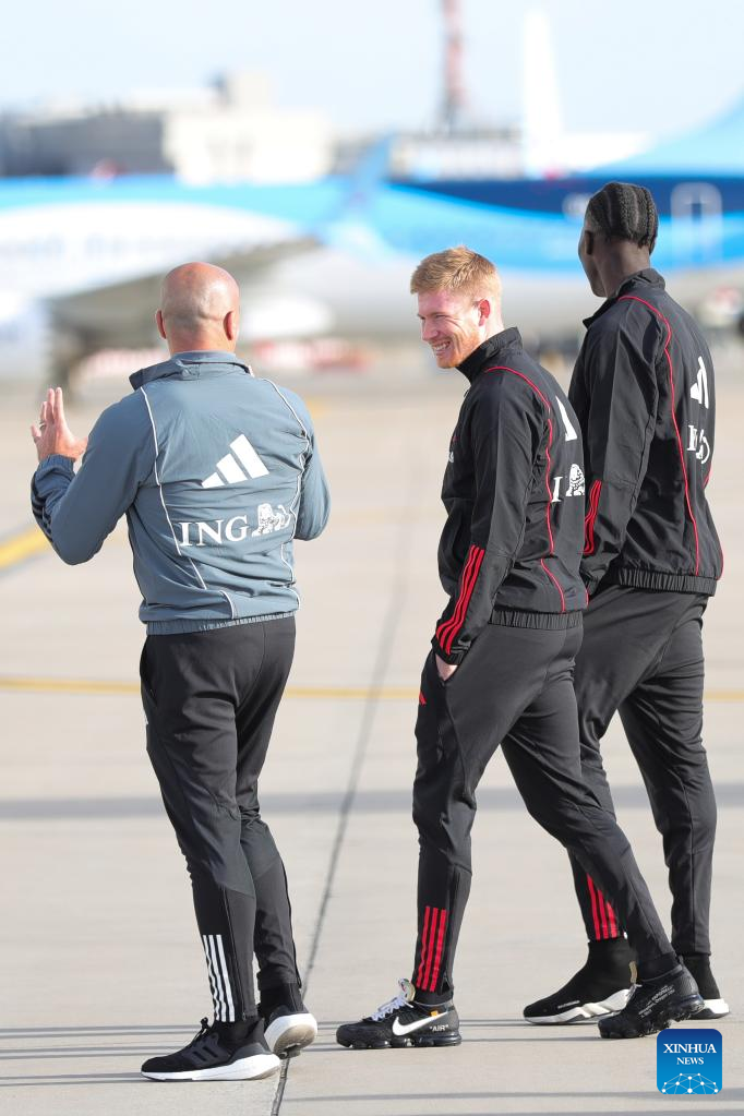 Kevin De Bruyne (C) of Team Belgium and head coach Roberto Martinez (L) are seen at the Brussels Airport in Zaventem, Belgium, Nov. 15, 2022. Team Belgium started their journey to the Middle East as they prepare for the upcoming Qatar 2022 World Cup. (Xinhua/Zheng Huansong)