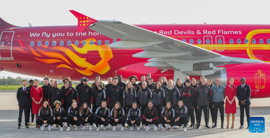 Members of Belgian national men and women football teams and the Brussels Airlines pose for photos with the new Trident airplane at the Brussels Airport in Zaventem, Belgium, Nov. 15, 2022. (Xinhua/Zheng Huansong)