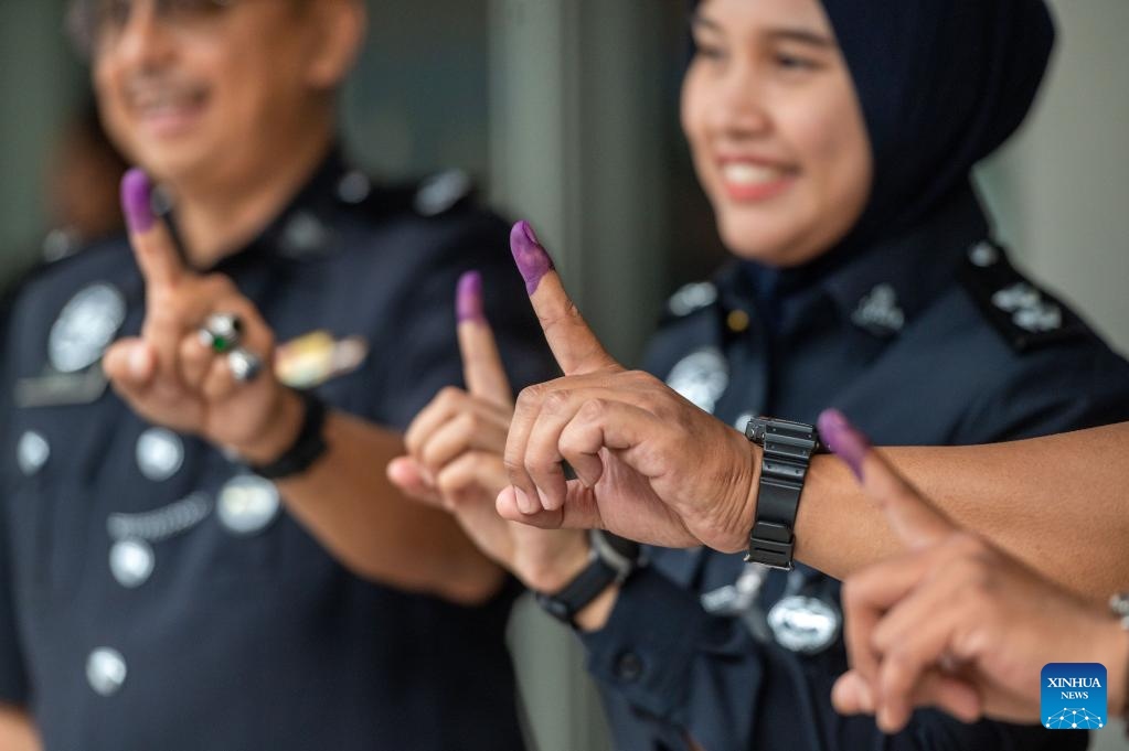 A police officer casts the vote in the early voting of the general election in Kuala Lumpur, Malaysia, Nov. 15, 2022. Malaysia will hold the general election on Nov. 19. (Photo by Chong Voon Chung/Xinhua)