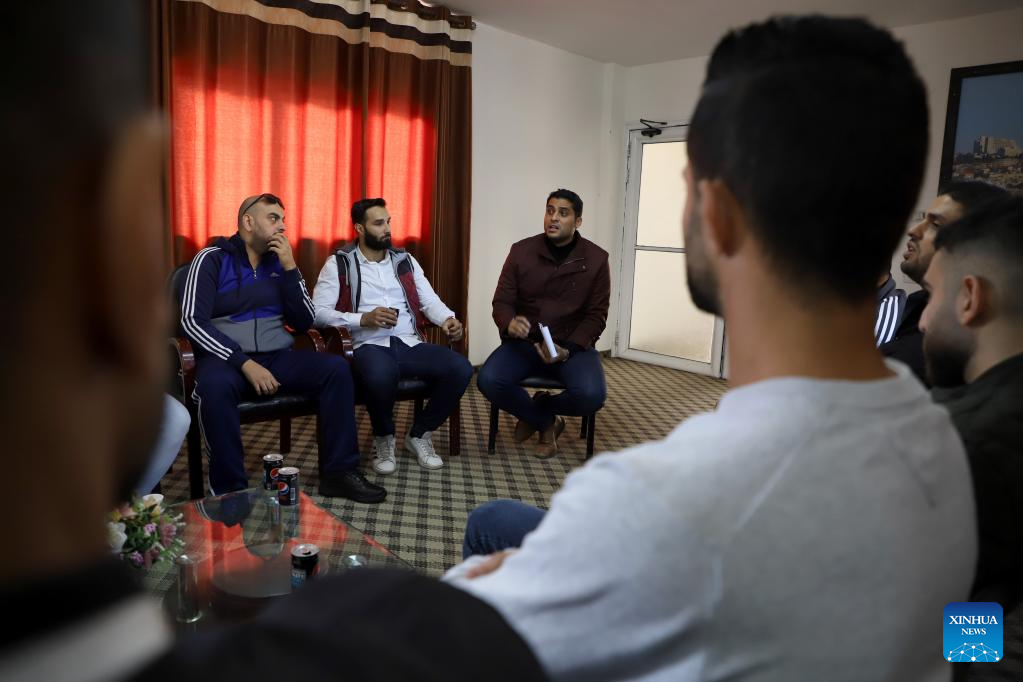 Palestinian volunteers for the FIFA World Cup Qatar 2022 attend a meeting in Gaza City, Nov. 10, 2022.(Photo by Rizek Abdeljawad/Xinhua)