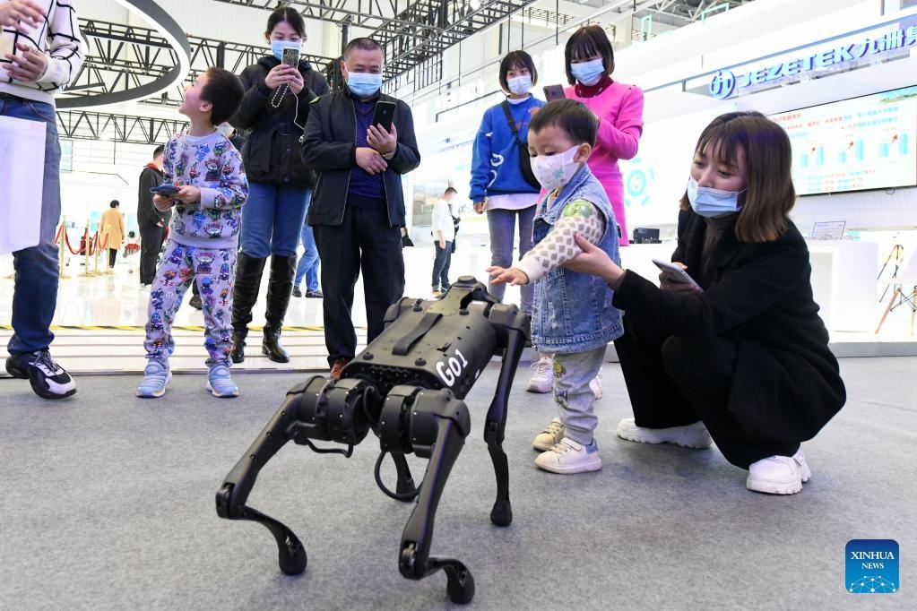 A child interacts with a robotic dog at the 10th China (Mianyang) Science and Technology City International High-Tech Expo in Mianyang, southwest China's Sichuan Province, Nov. 16, 2022.
