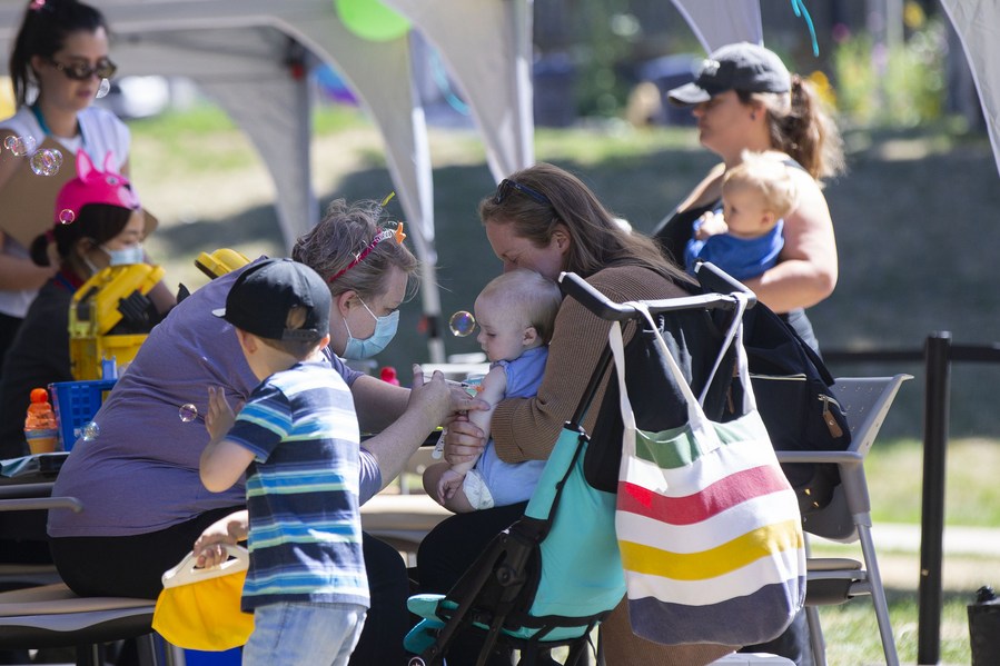 A mother helps her baby receive a COVID-19 vaccine at a COVID-19 vaccination site in East Lynn Park in Toronto, Canada, Aug. 12, 2022. (Photo by Zou Zheng/Xinhua)