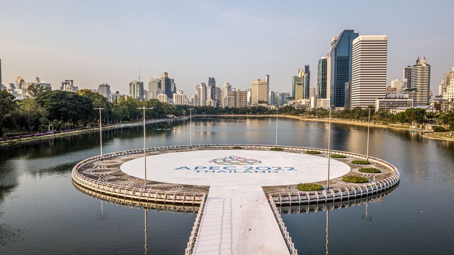 A logo of APEC 2022 is pictured in Bangkok, Thailand, Nov. 16, 2022. (Xinhua/Wang Teng)