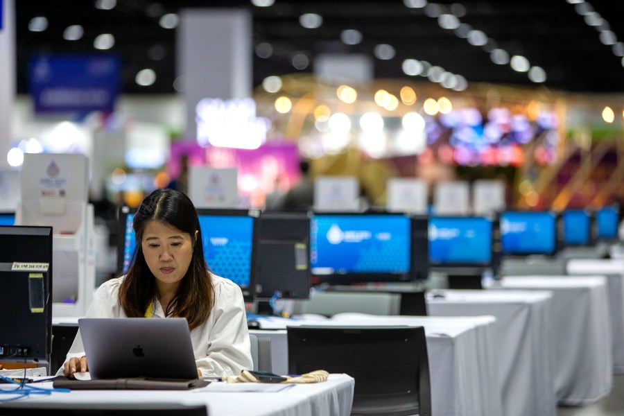 A staff member works at the media center of APEC 2022 in Bangkok, Thailand, Nov. 14, 2022. (Xinhua/Wang Teng)