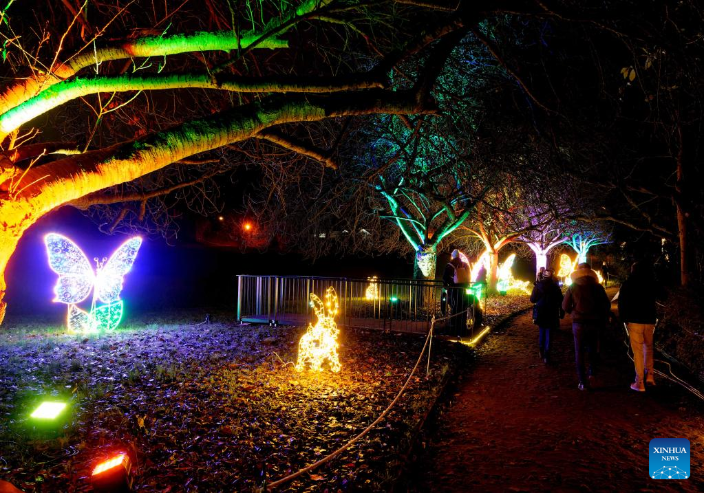 Visitors walk past light decorations during the "Christmas Garden Berlin" light show at the Botanical Garden in Berlin, Germany, Nov. 16, 2022. (Photo by Stefan Zeitz/Xinhua)