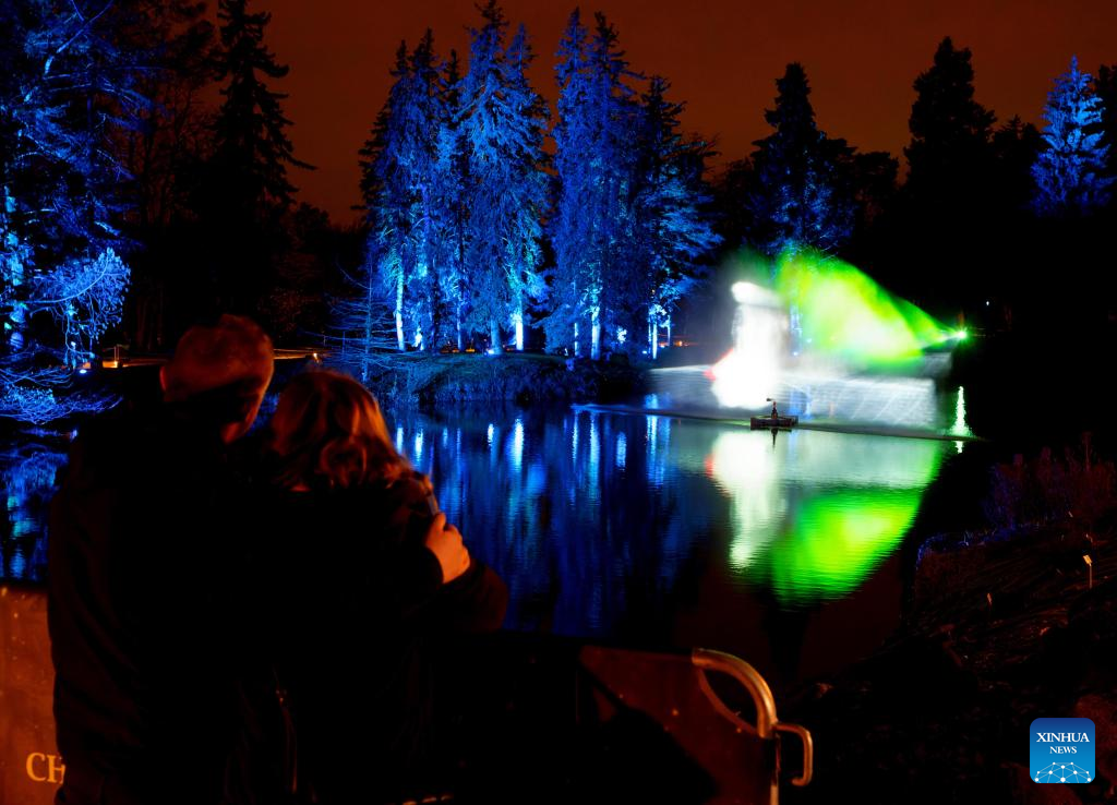 Visitors look at light decorations during the "Christmas Garden Berlin" light show at the Botanical Garden in Berlin, Germany, Nov. 16, 2022. (Photo by Stefan Zeitz/Xinhua)