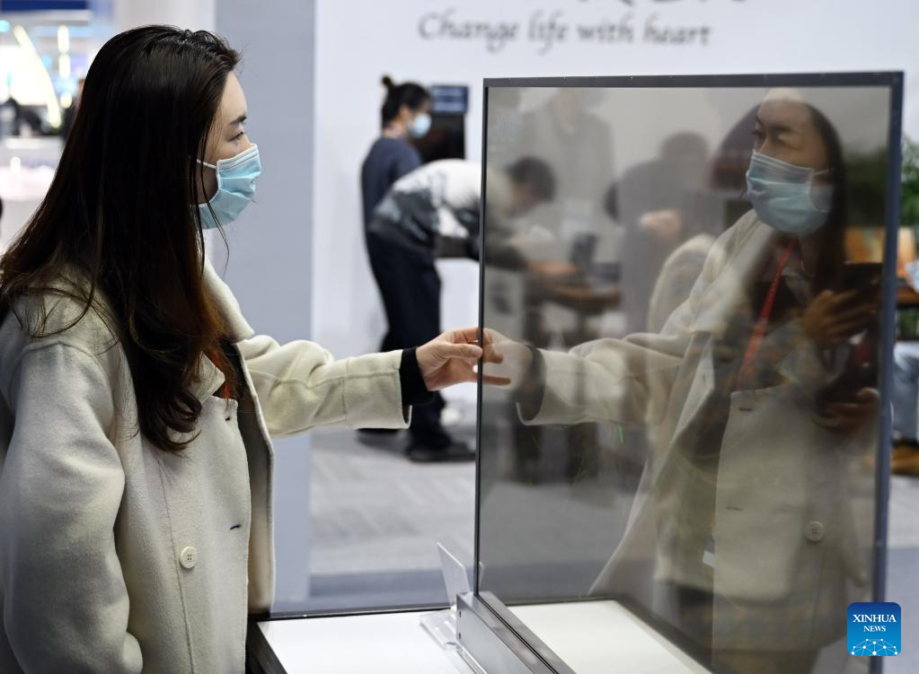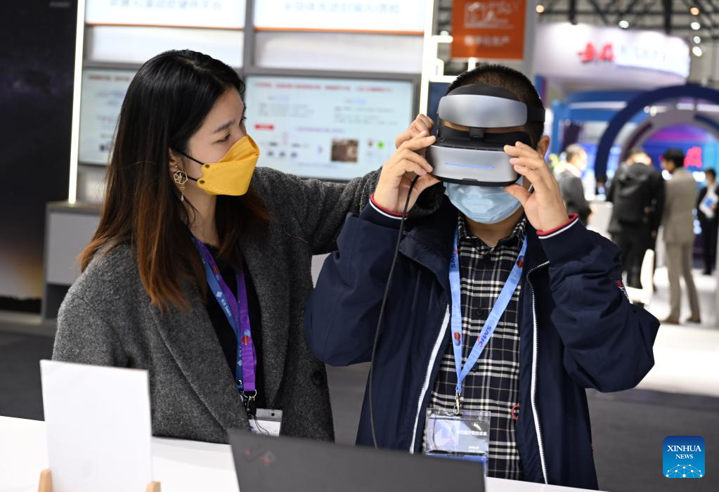 A visitor tries a product at the World Conference on Integrated Circuits 2022 in Hefei, east China's Anhui Province, Nov. 17, 2022. (Xinhua/Zhou Mu)