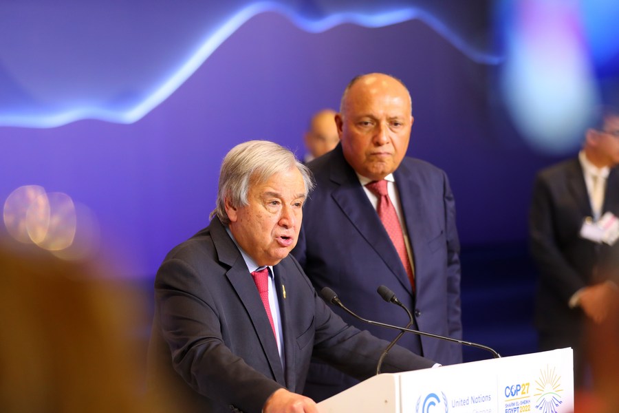 United Nations Secretary-General Antonio Guterres (Front) speaks during a press briefing at the 27th session of the Conference of the Parties (COP27) to the United Nations Framework Convention on Climate Change in Sharm El-Sheikh, Egypt, Nov. 17 2022. (Xinhua/Sui Xiankai)