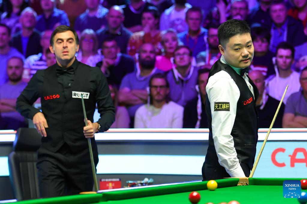 Ding Junhui (R) of China competes during the quarter final match against Ronnie O'Sullivan of England at 2022 UK Snooker Championship in York, Britain, Nov. 18, 2022. (Photo by Zhai Zheng/Xinhua)