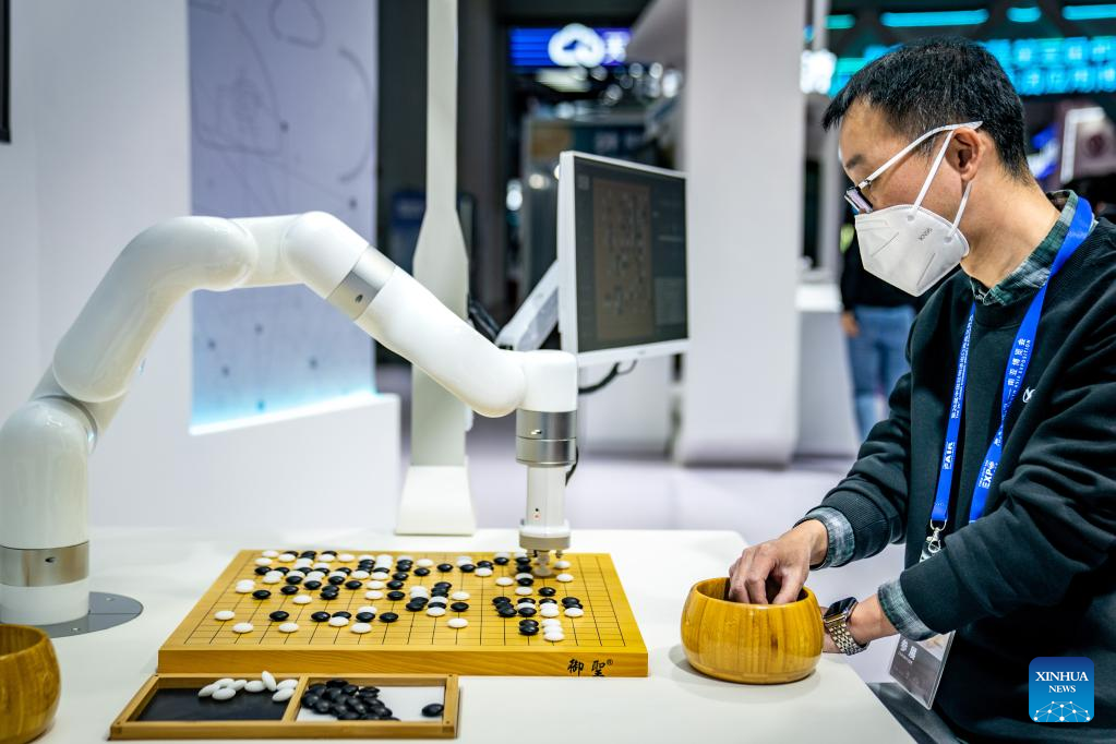An exhibitor plays Go game, known as Weiqi in Chinese, with a robot at the booth of iFLYTEK at the 6th China-South Asia Exposition in Kunming, southwest China's Yunnan Province, Nov. 19, 2022. (Xinhua/Hu Chao)