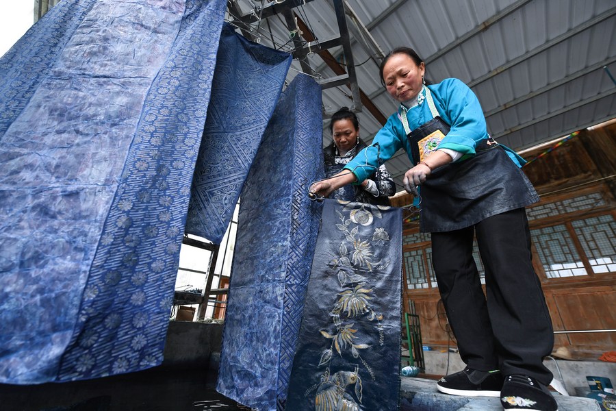 Villagers make batik products at a batik workshop in Kala Village in Longquan Township of Danzhai County, southwest China's Guizhou Province, Nov. 16, 2022. (Xinhua/Yang Wenbin)