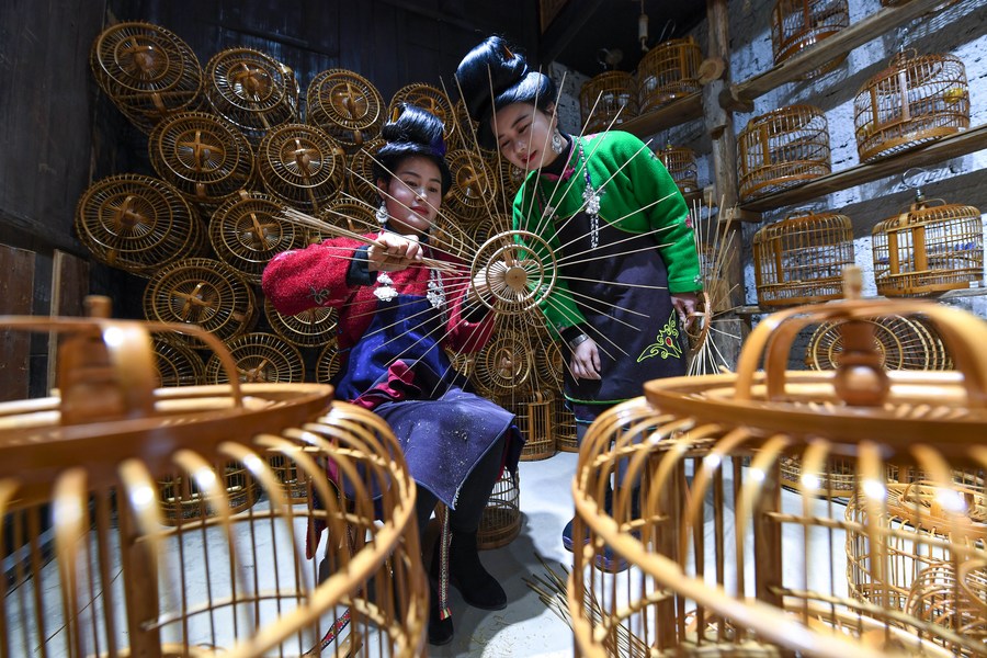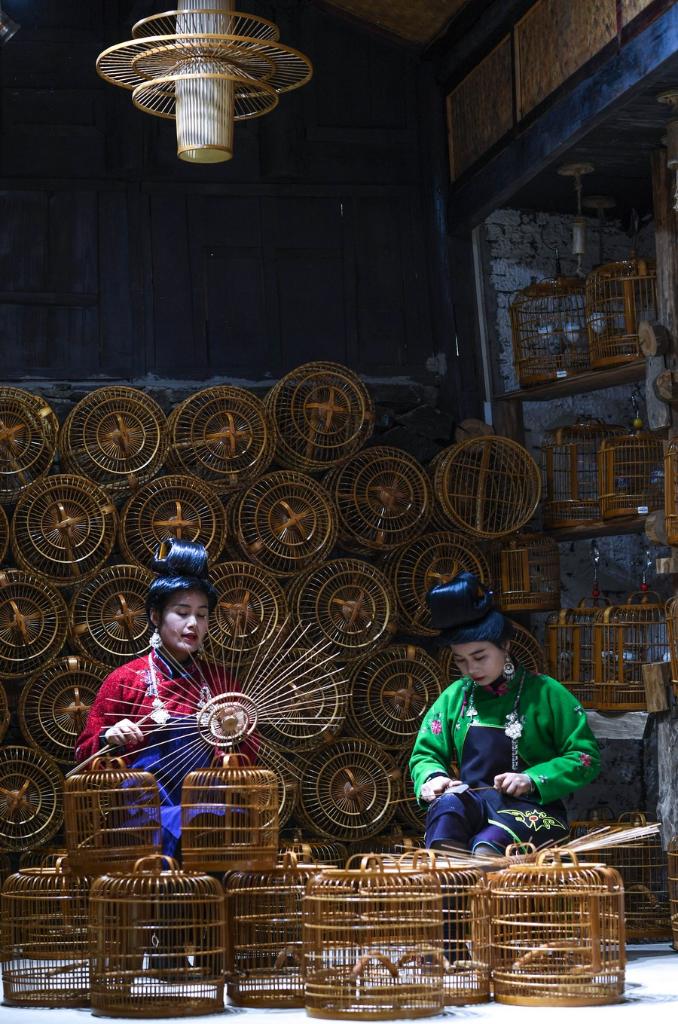 Craftswomen weave bamboo birdcages at a workshop in Kala Village in Longquan Township of Danzhai County, southwest China's Guizhou Province, Nov. 16, 2022. (Xinhua/Yang Wenbin)