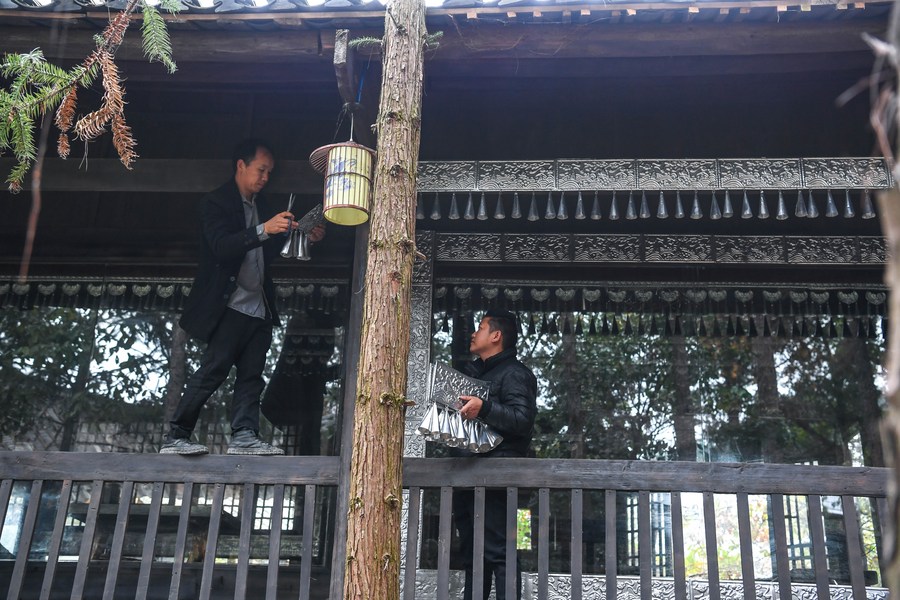 Villagers suspend silver ornaments on a traditional building of Miao ethnic group in Kala Village in Longquan Township of Danzhai County, southwest China's Guizhou Province, Nov. 16, 2022. (Xinhua/Yang Wenbin)