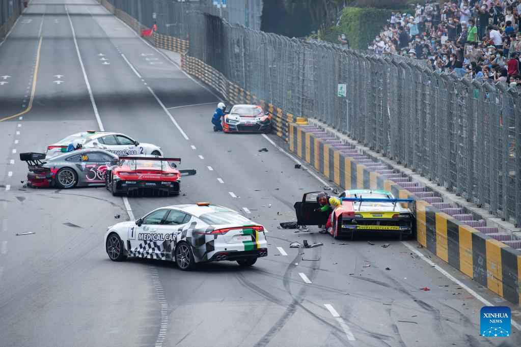 Cars crash during the Macao GT Cup race at the 69th Macao Grand Prix in Macao, south China, Nov. 19, 2022. (Xinhua/Cheong Kam Ka)