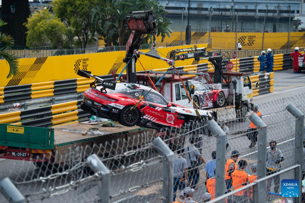 Cars are removed from the track after a crash during the Macao GT Cup race at the 69th Macao Grand Prix in Macao, south China, Nov. 19, 2022. (Xinhua/Cheong Kam Ka)
