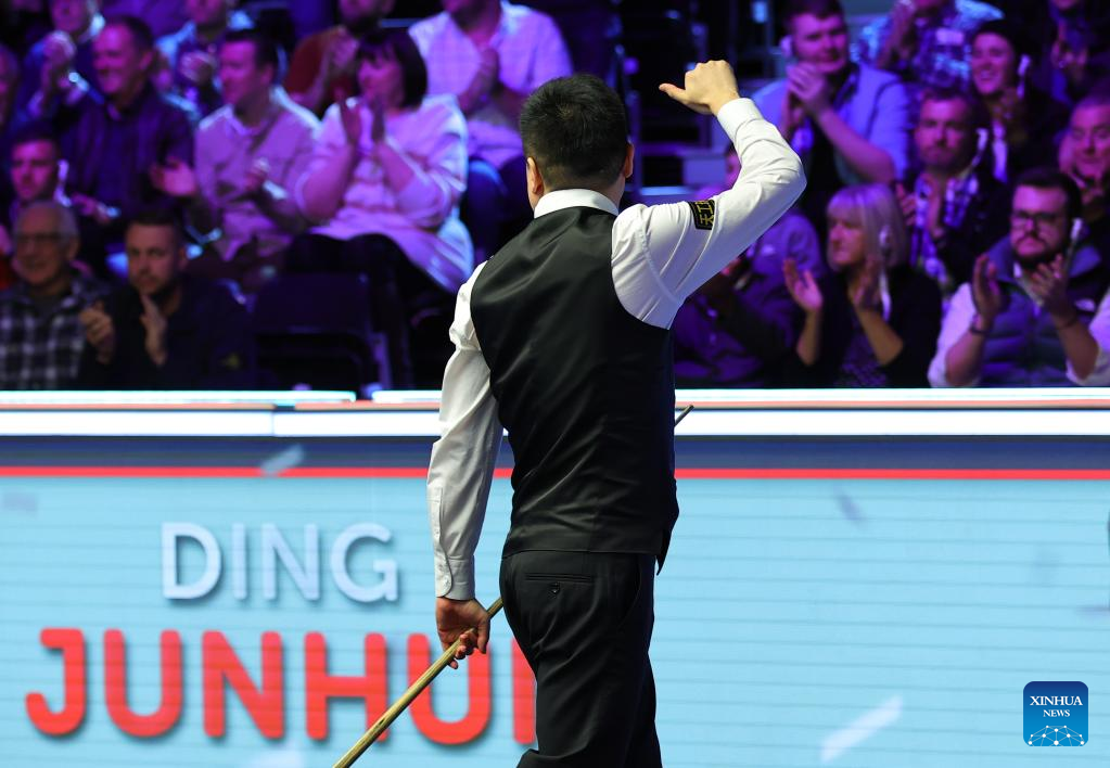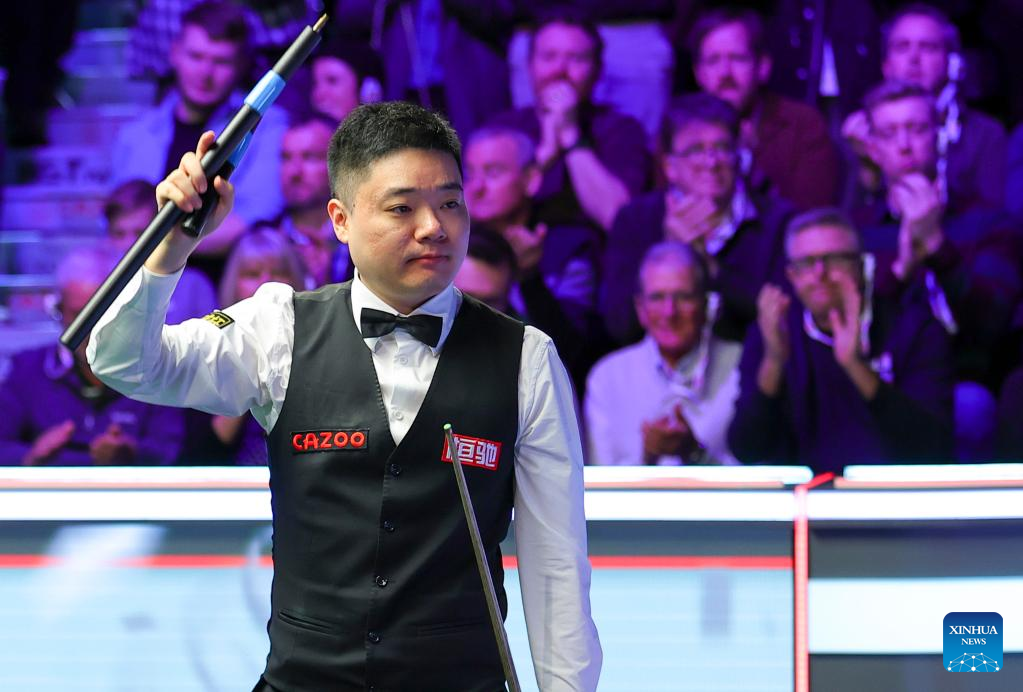 Ding Junhui of China celebrates after the semifinal match against Tom Ford of England at 2022 UK Snooker Championship in York, Britain, Nov. 19, 2022. (Photo by Zhai Zheng/Xinhua)