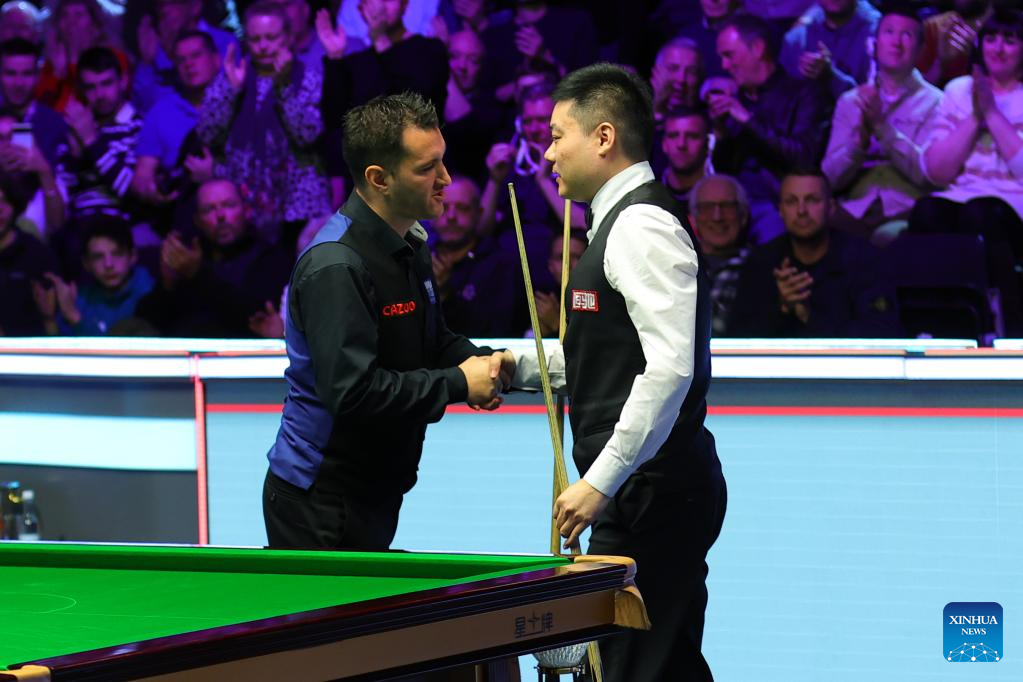 Ding Junhui (R) of China shakes hands with Tom Ford of England after the semifinal match at 2022 UK Snooker Championship in York, Britain, Nov. 19, 2022. (Photo by Zhai Zheng/Xinhua)