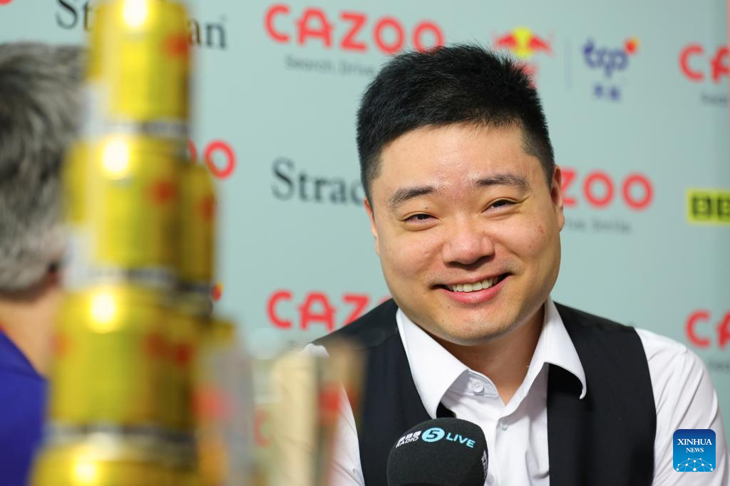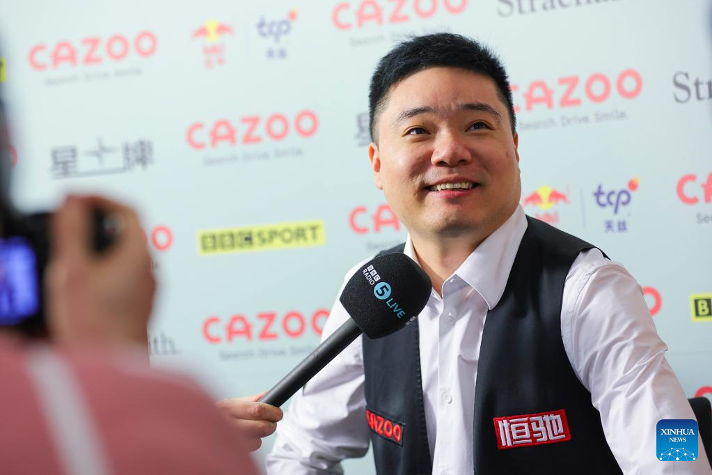 Ding Junhui of China answers questions from press after the semifinal match against Tom Ford of England at 2022 UK Snooker Championship in York, Britain, Nov. 19, 2022. (Photo by Zhai Zheng/Xinhua)