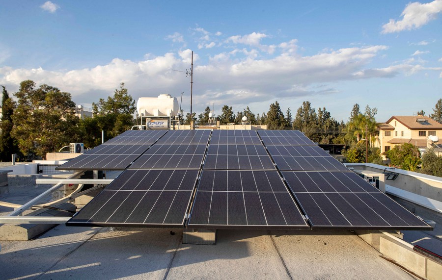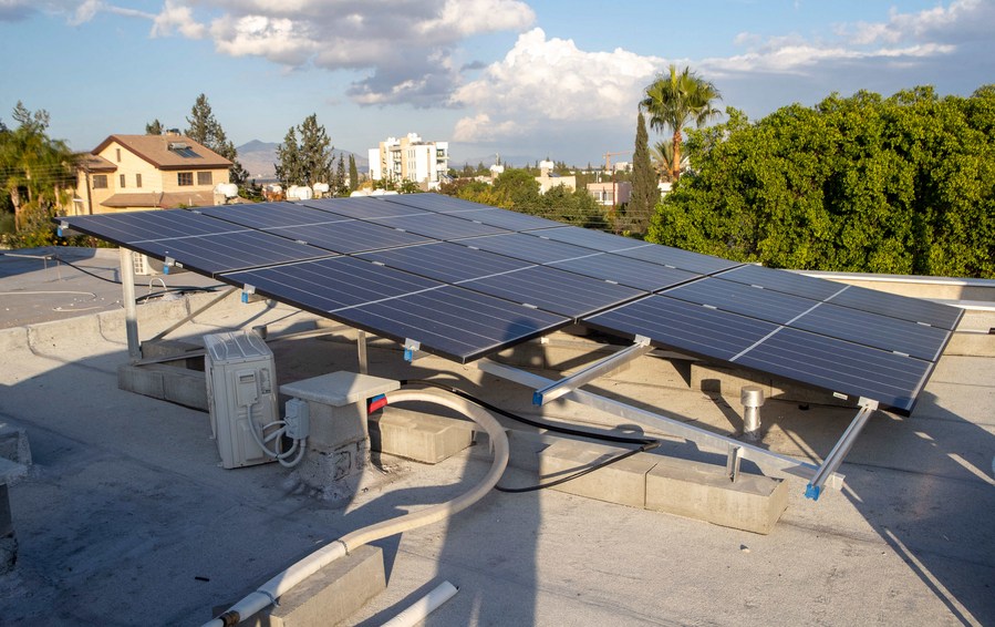 Solar panels are seen on the roof of a house in Nicosia, Cyprus on Nov. 18, 2022. (Photo by George Christophorou/Xinhua)