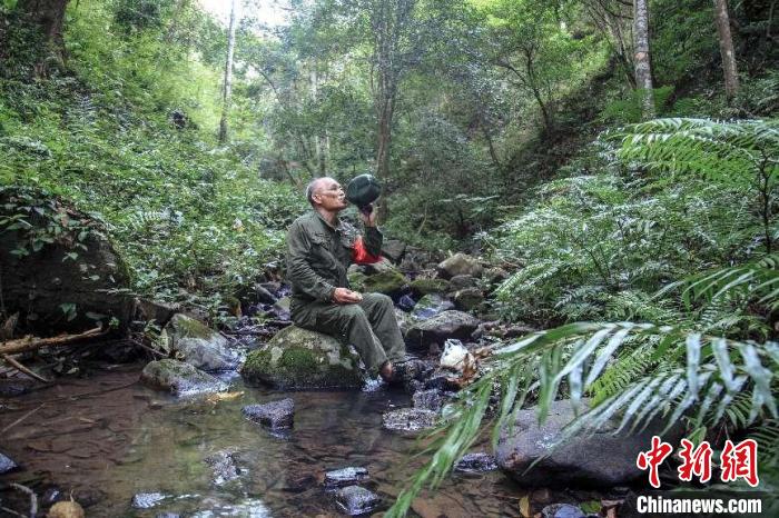 Gu Decai drinks water from a stream. (Chinanews.com/courtesy of the publicity department of the Communist Party of China Anyuan County committee)