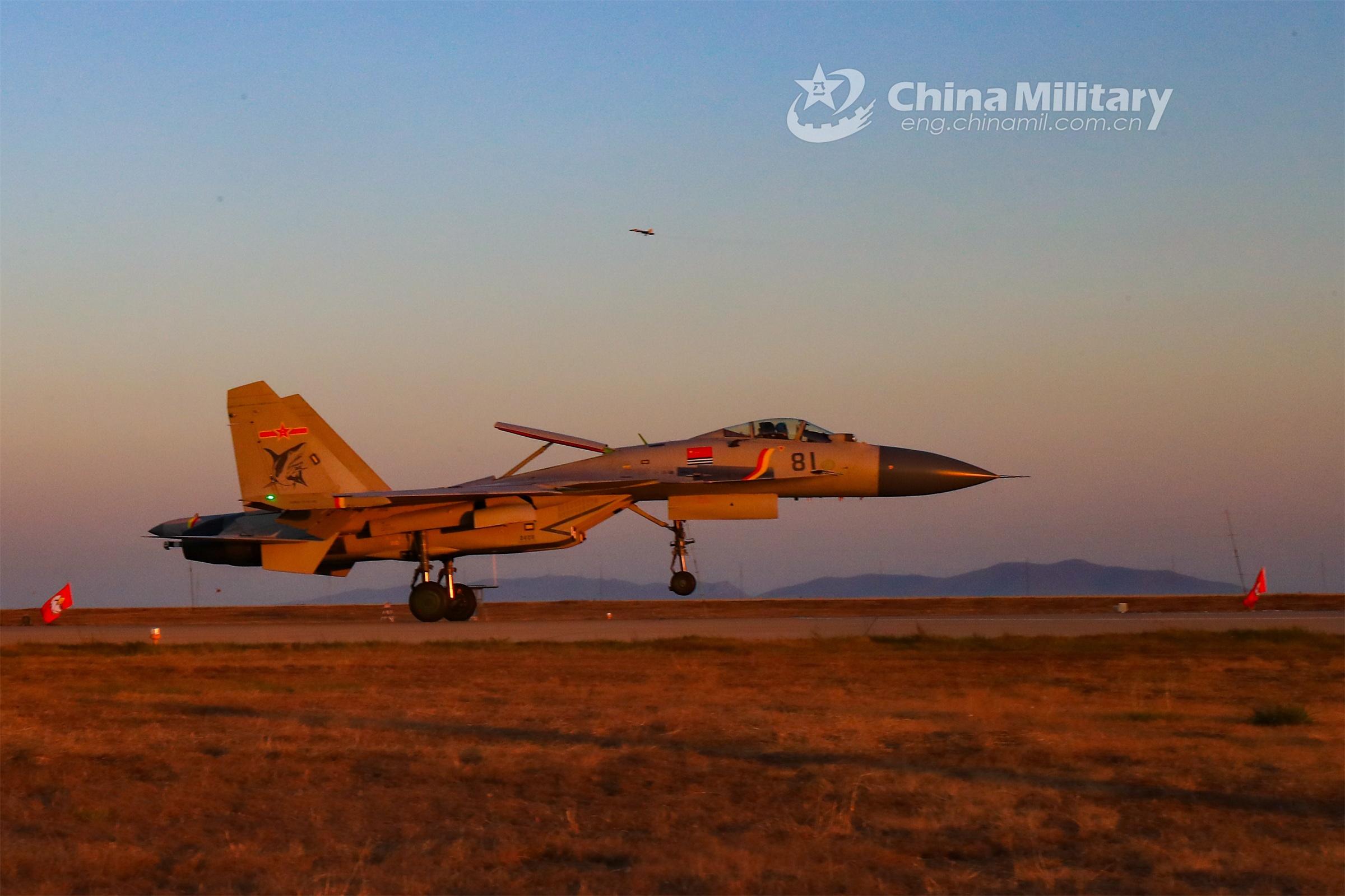 A fighter jet attached to a training base under the PLA Naval Aviation University takes off for a sortie during a flight training course in mid November, 2022. (eng.chinamil.com.cn/Photo by Jiang Tao)