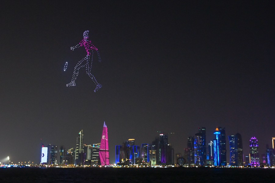 This photo taken on Nov. 19, 2022 shows the drone performance on the opening ceremony of the FIFA Fan Festival in Doha, Qatar. (Photo by Nikku/Xinhua)