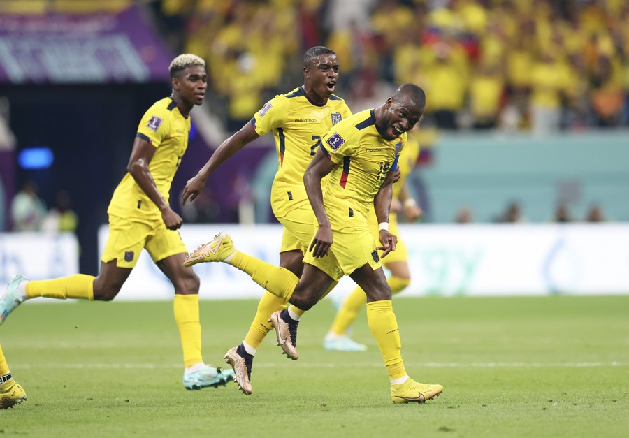 Enner Valencia (R) of Ecuador celebrates scoring with his teammates during the Group A match between Qatar and Ecuador at the 2022 FIFA World Cup at the Al Bayt Stadium in Al Khor, Qatar, Nov. 20, 2022. (Xinhua/Li Ming)
