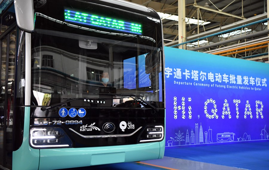 An e-bus produced by Yutong is seen during the departure ceremony of Yutong electric vehicles to Qatar in Zhengzhou, central China's Henan Province, Dec. 17, 2021. (Xinhua/Li Jianan)