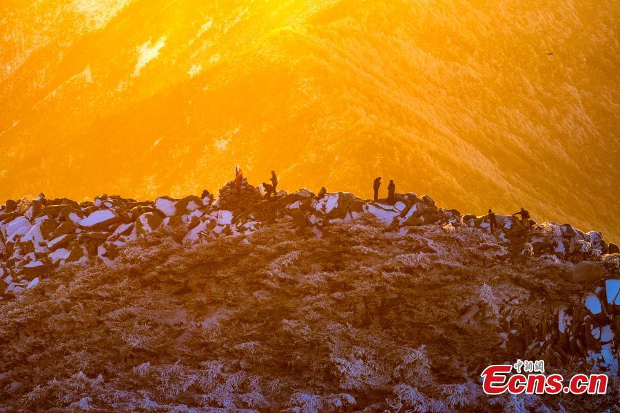 Winter sunrise shines on the mountain peak in Zhuque National Forest Park in Xi'an, northwest China's Shaanxi Province, Nov. 22, 2022, turning it into a white fairyland. (Photo: China News Service/Cheng Wenying)