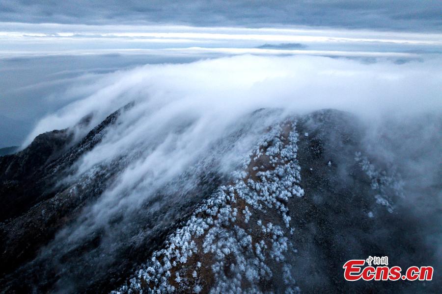 Winter sunrise shines on the mountain peak in Zhuque National Forest Park in Xi'an, northwest China's Shaanxi Province, Nov. 22, 2022, turning it into a white fairyland. (Photo: China News Service/Cheng Wenying)