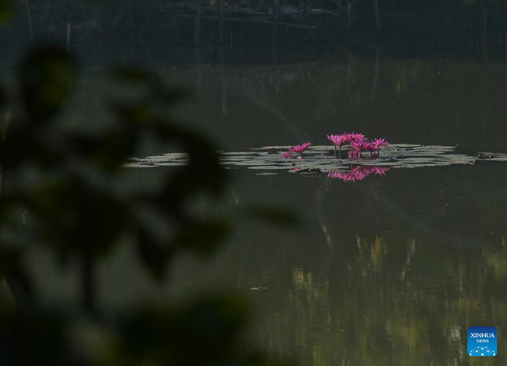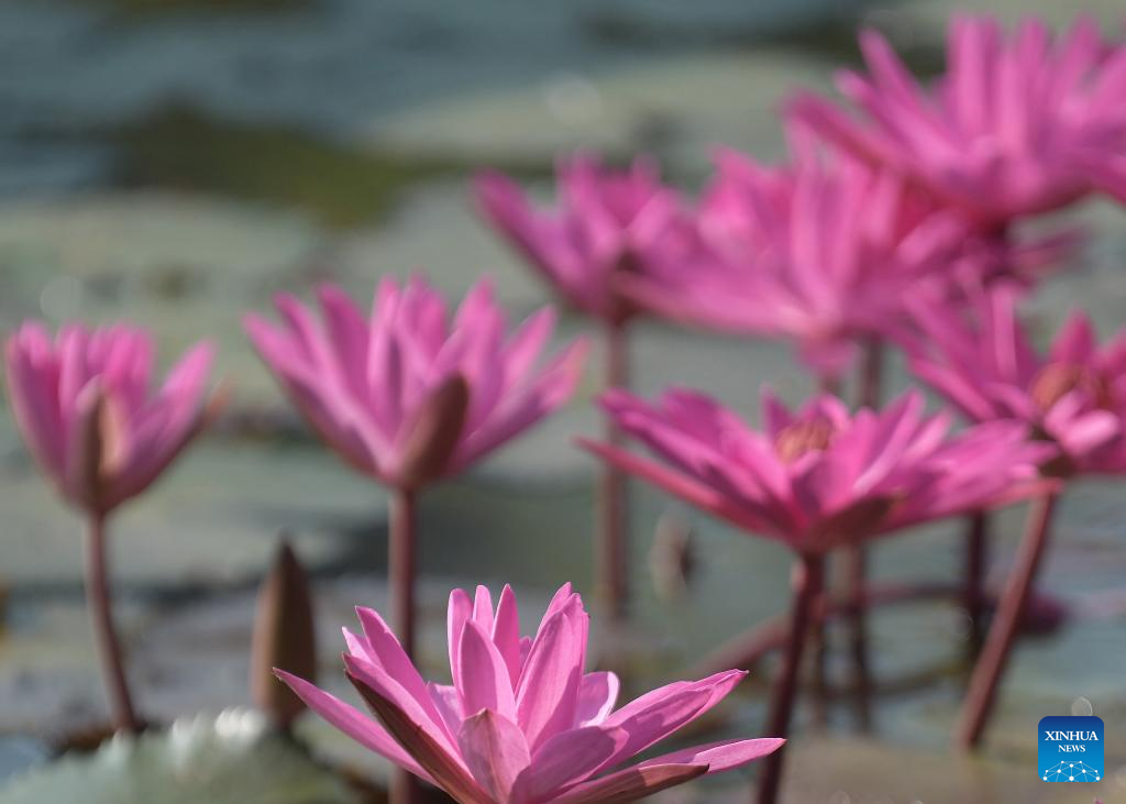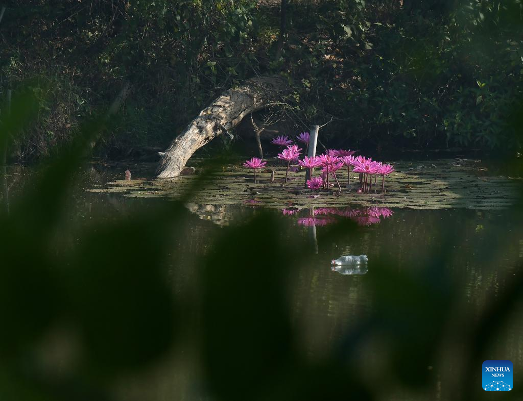 Pink water lily flowers are seen in a lake in Agartala, capital city of India's northeastern state of Tripura, Nov. 22, 2022. (Str/Xinhua)