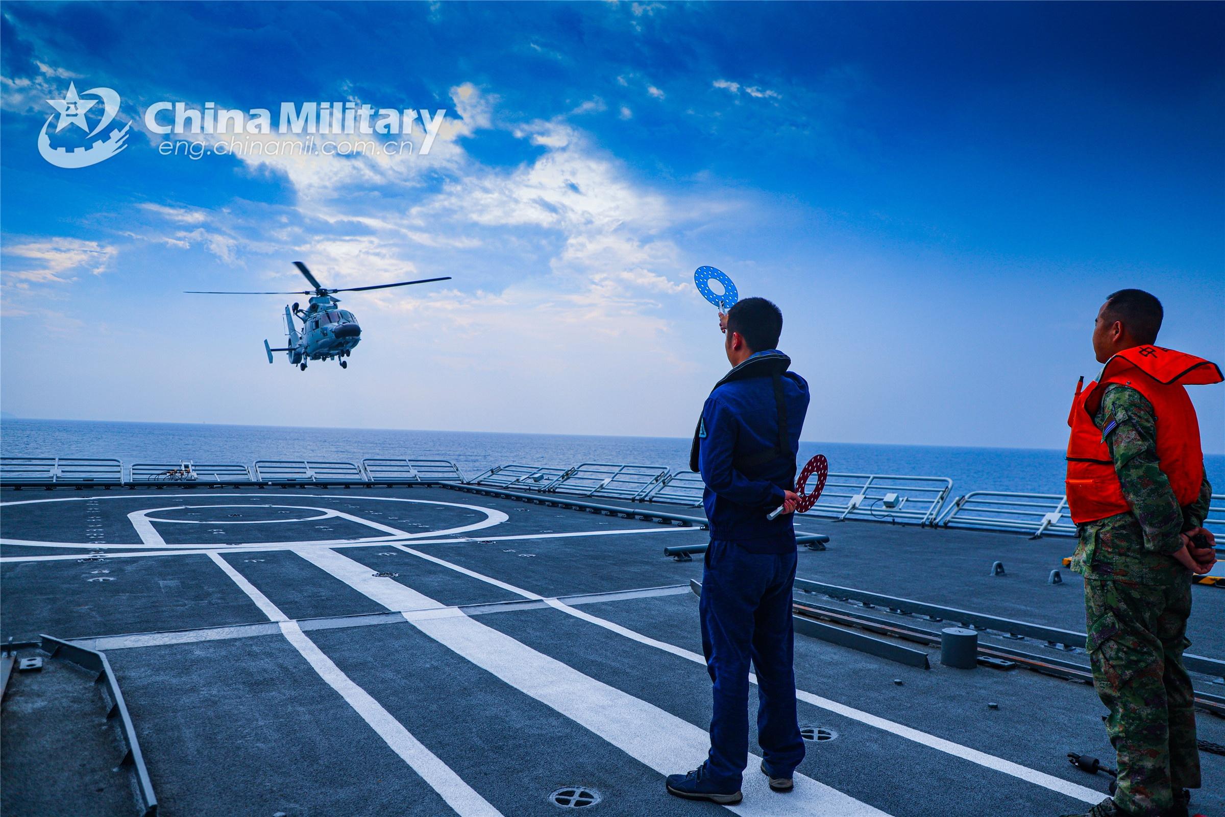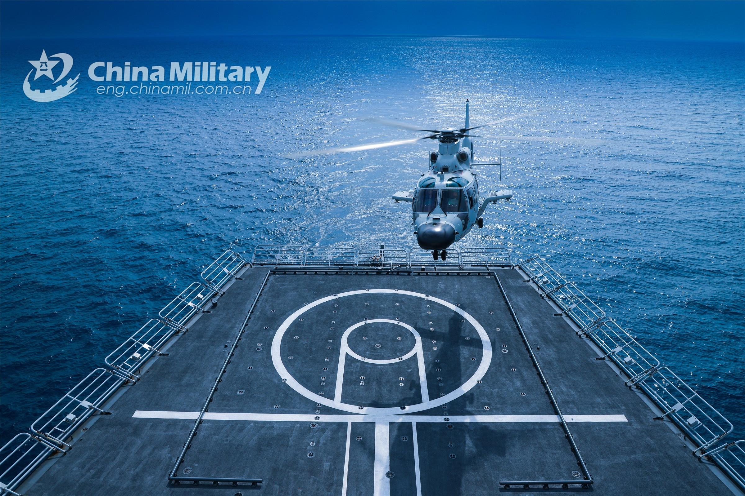 A ship-borne helicopter attached to a naval combat support flotilla under the PLA Southern Theater Command conducts takeoff and landing training during a maritime training exercise on September 28, 2022. (eng.chinamil.com.cn/Photo by Li Junlin)