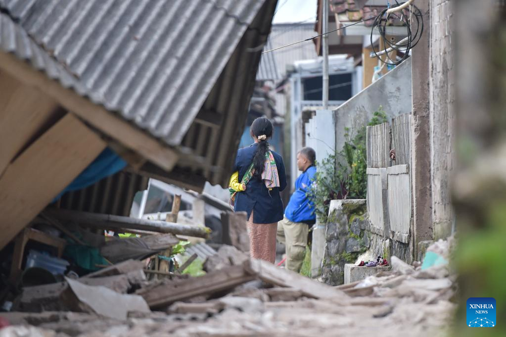 Local residents are pictured near damaged houses after a 5.6-magnitude earthquake at Mangunkerta village in Cianjur, West Java, Indonesia, Nov. 23, 2022. (Xinhua/Veri Sanovri)