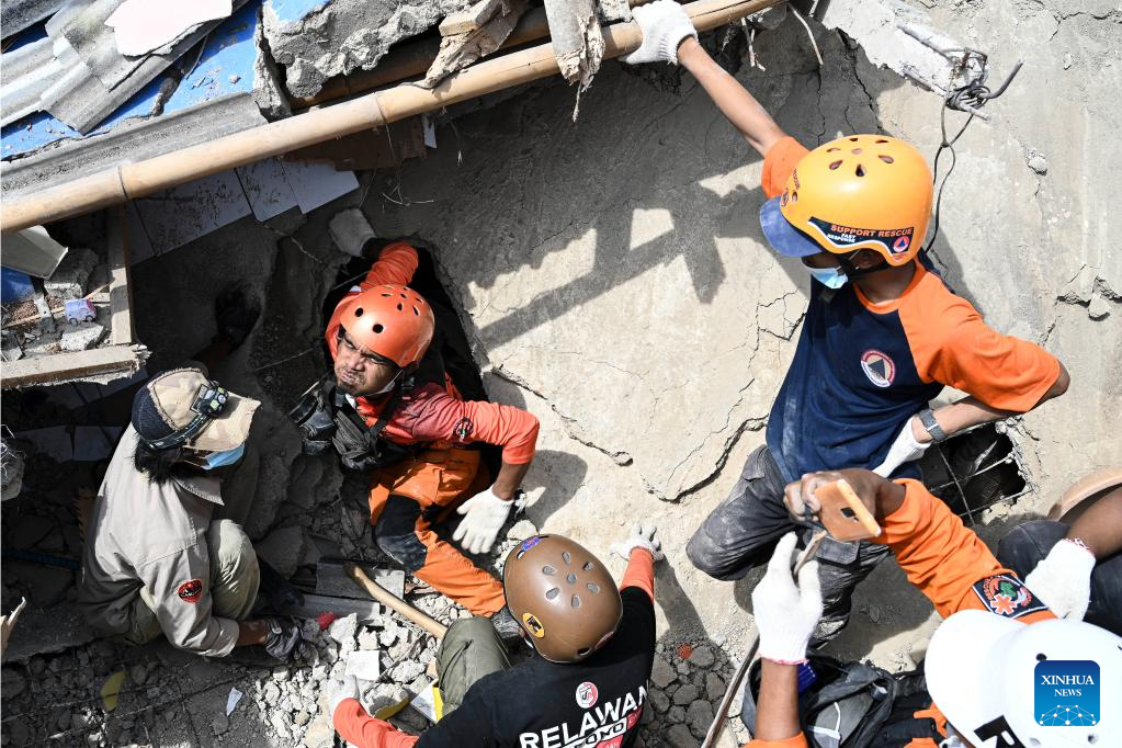 Rescuers dismantle the rubble of damaged houses to evacuate survivors after a 5.6-magnitude earthquake at Mangunkerta village in Cianjur, West Java, Indonesia, Nov. 23, 2022. (Xinhua/Veri Sanovri)