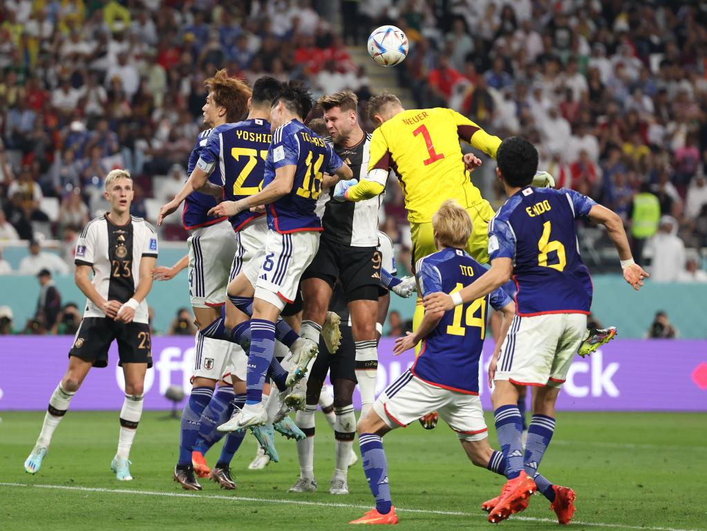 Manuel Neuer (top, 1st R), goalkeeper of Germany, vies for a header during the Group E match between Germany and Japan at the 2022 FIFA World Cup at Khalifa International Stadium in Doha, Qatar, Nov. 23, 2022. (Xinhua/Cao Can)