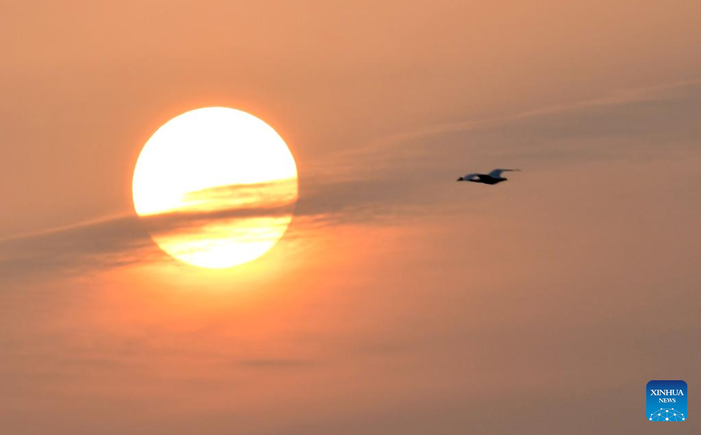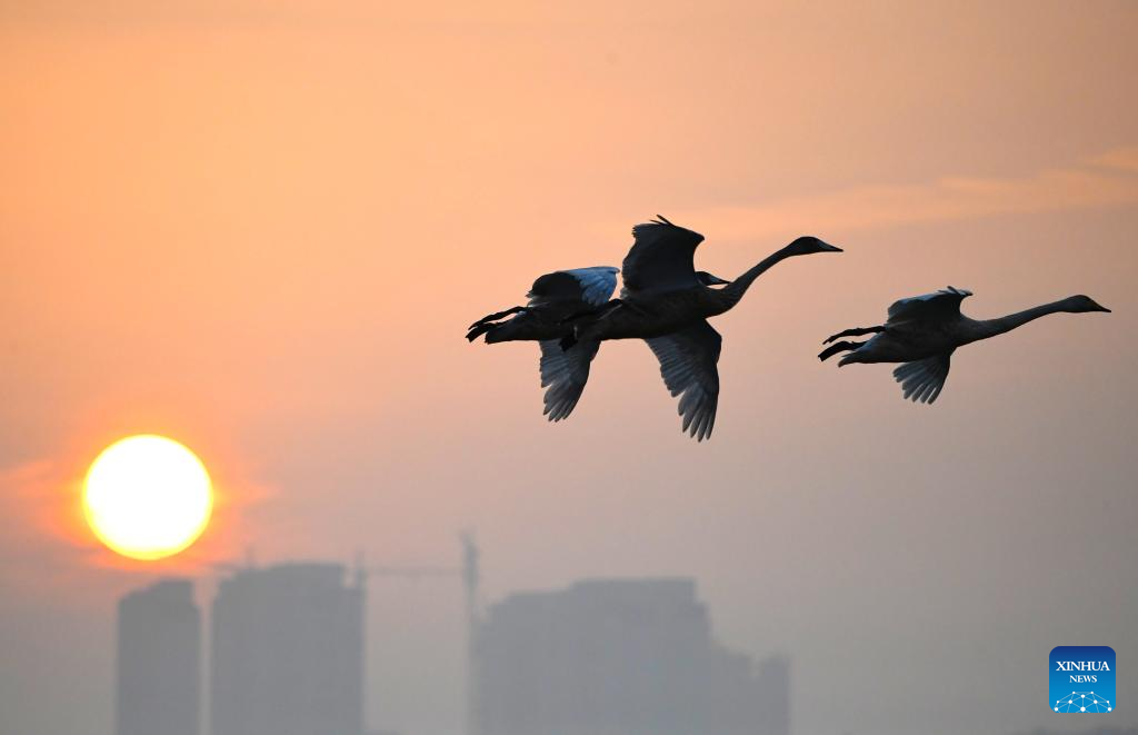 Swans fly over a wetland in Sanmenxia, central China's Henan Province, Nov. 23, 2022. A large number of migratory swans flied to the Yellow River wetland in Sanmenxia to spend winter. (Xinhua/Hao Yuan)