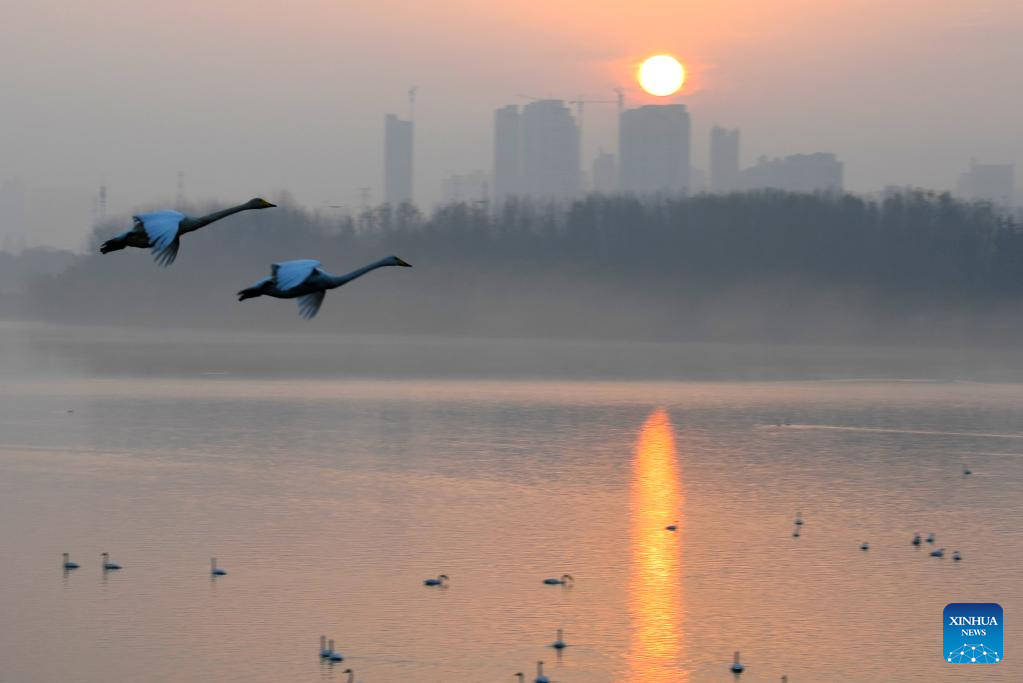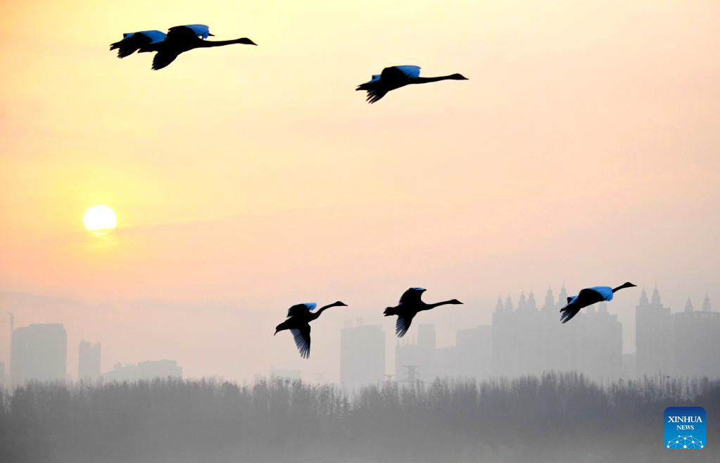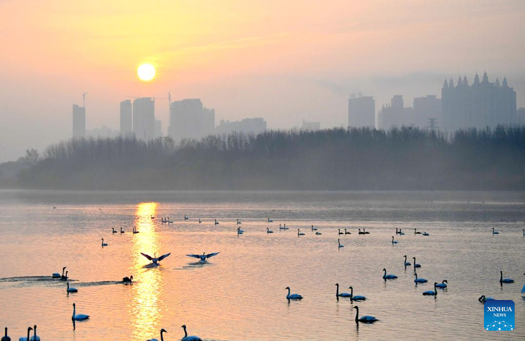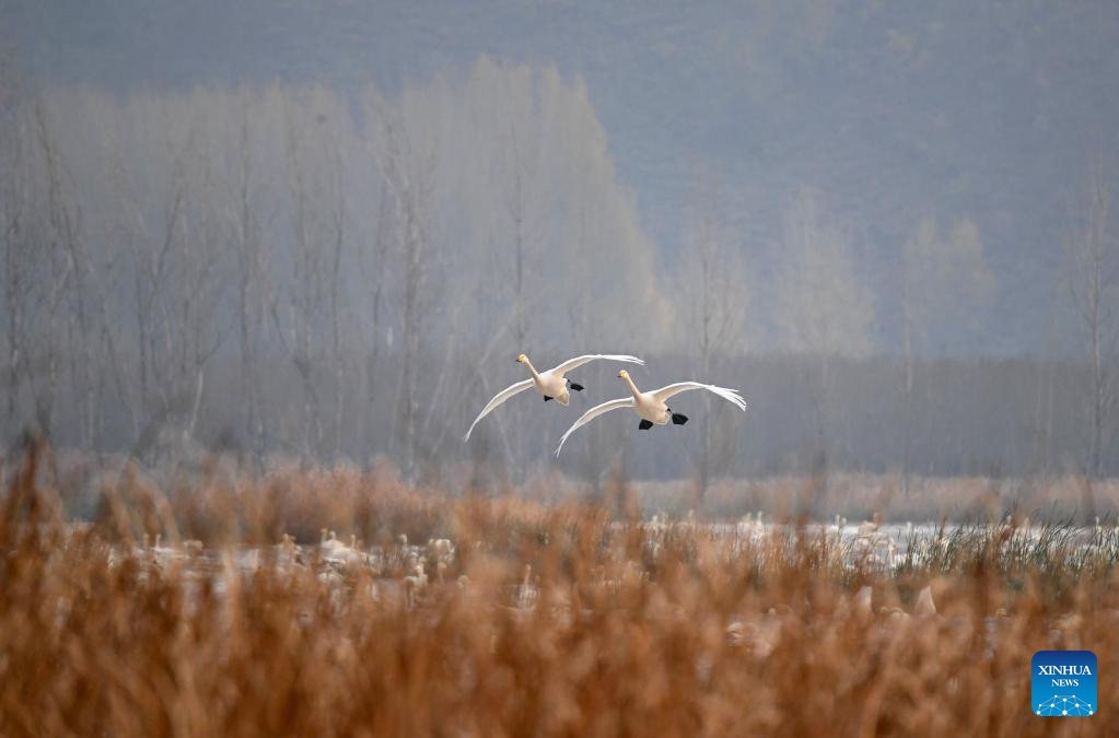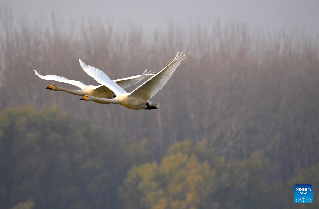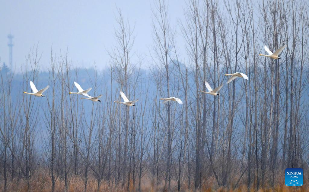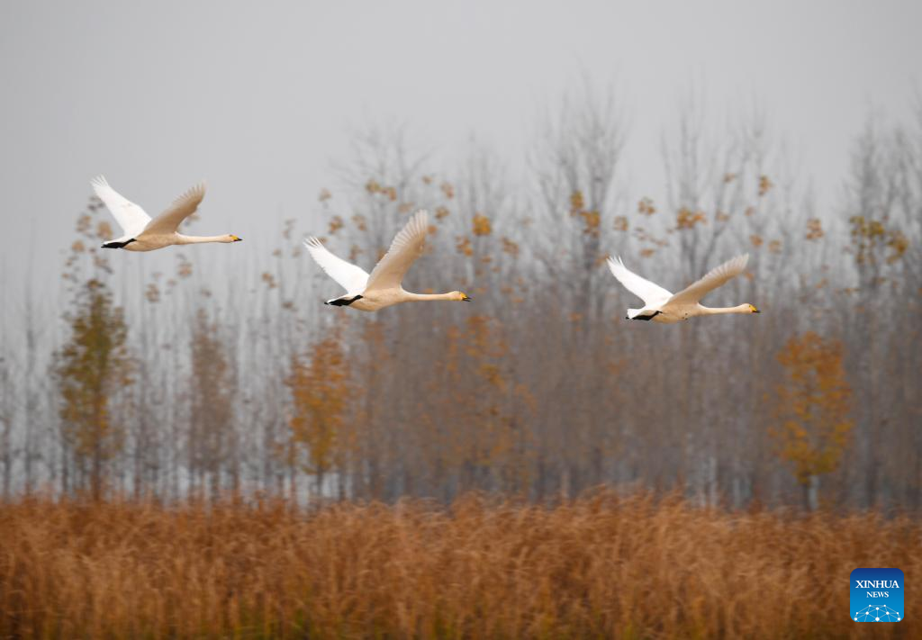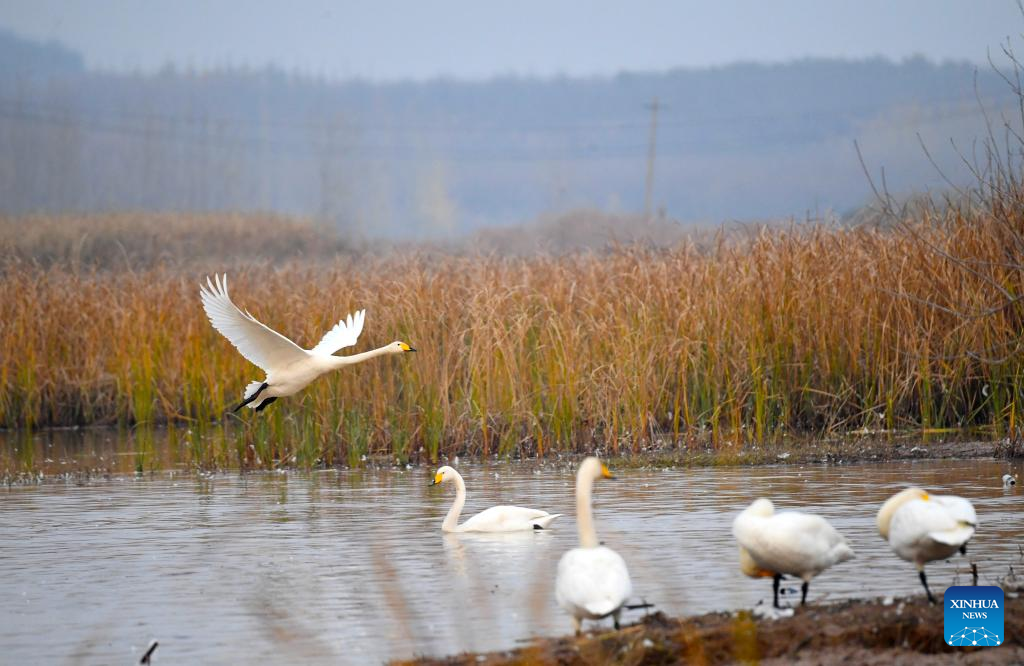 Migratory swans fly to C China's Yellow River wetland to spend winter