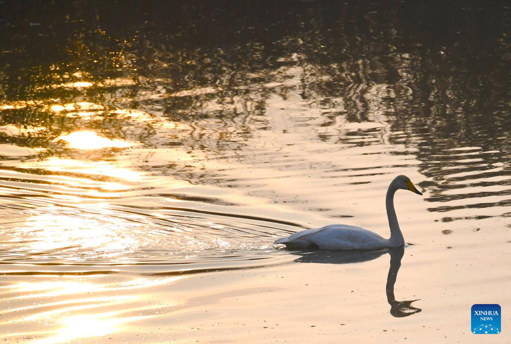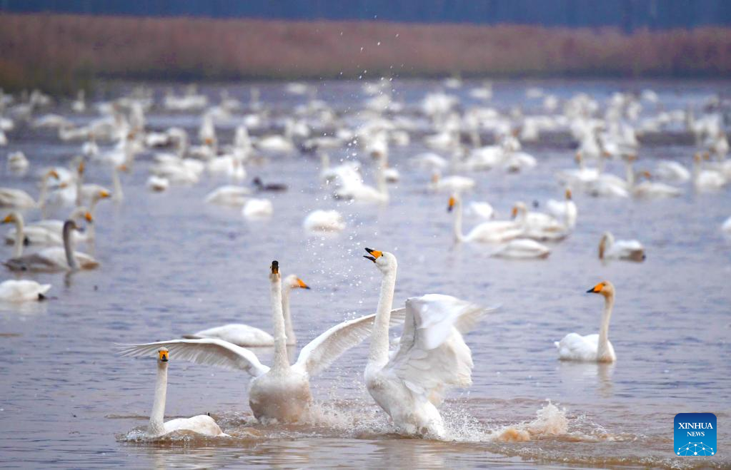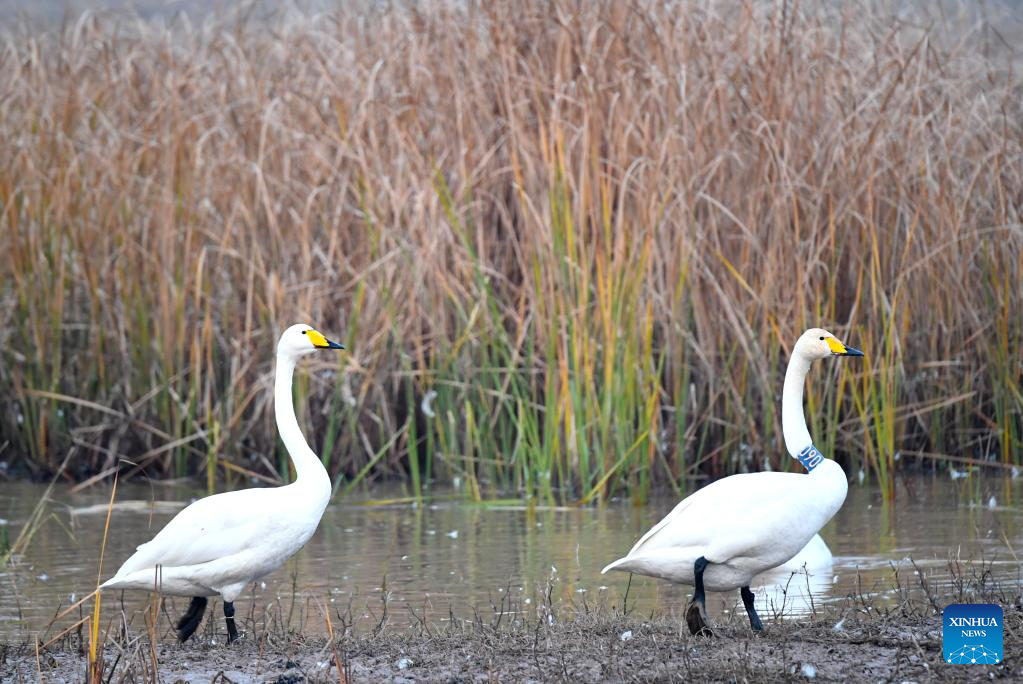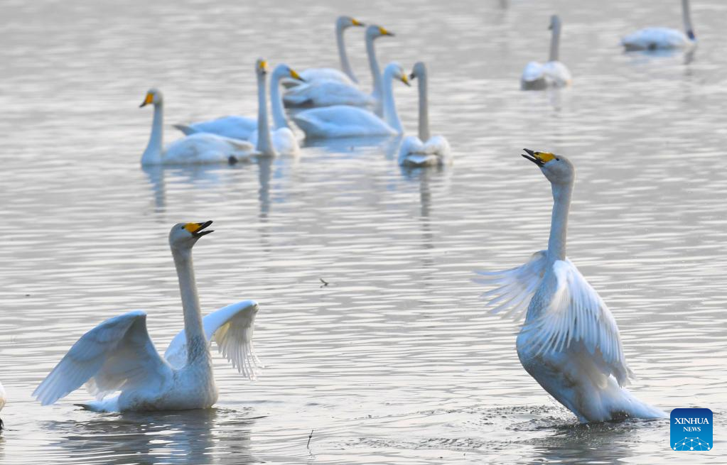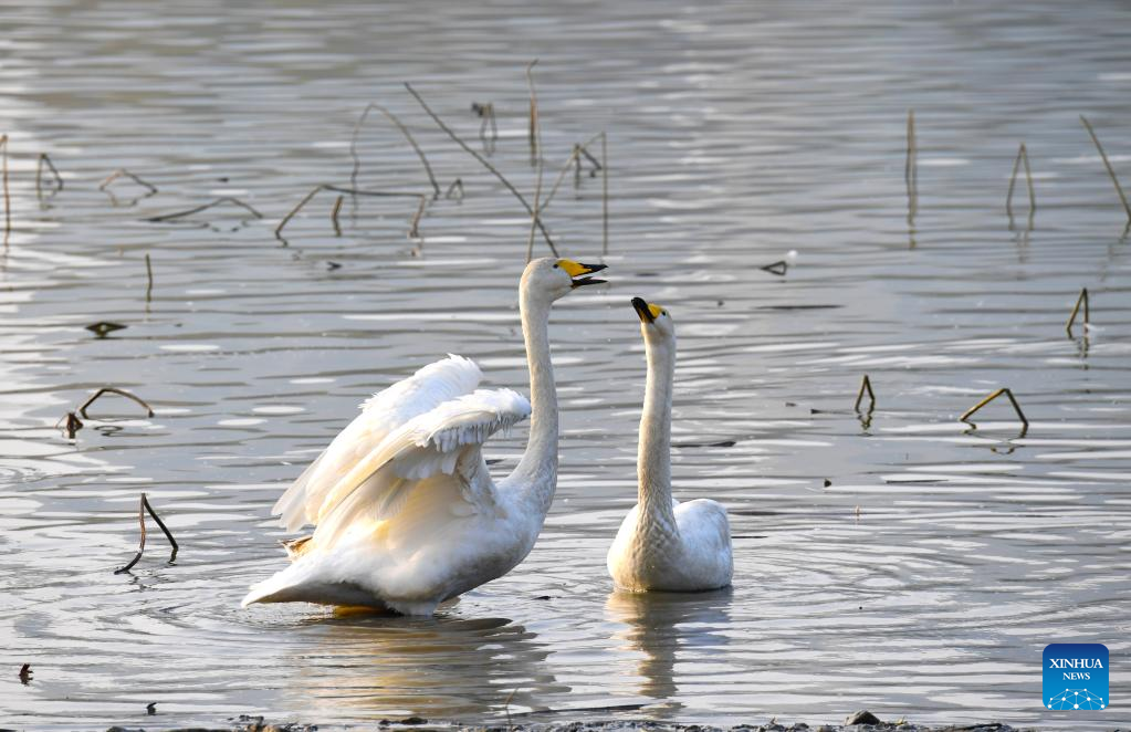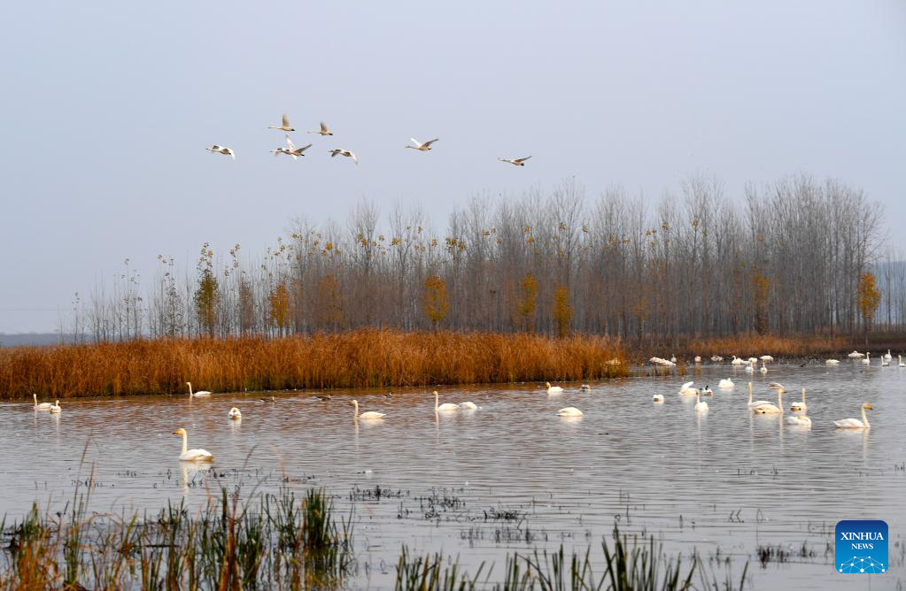Swans are seen at a wetland in Sanmenxia, central China's Henan Province, Nov. 23, 2022. A large number of migratory swans flied to the Yellow River wetland in Sanmenxia to spend winter. (Xinhua/Hao Yuan)