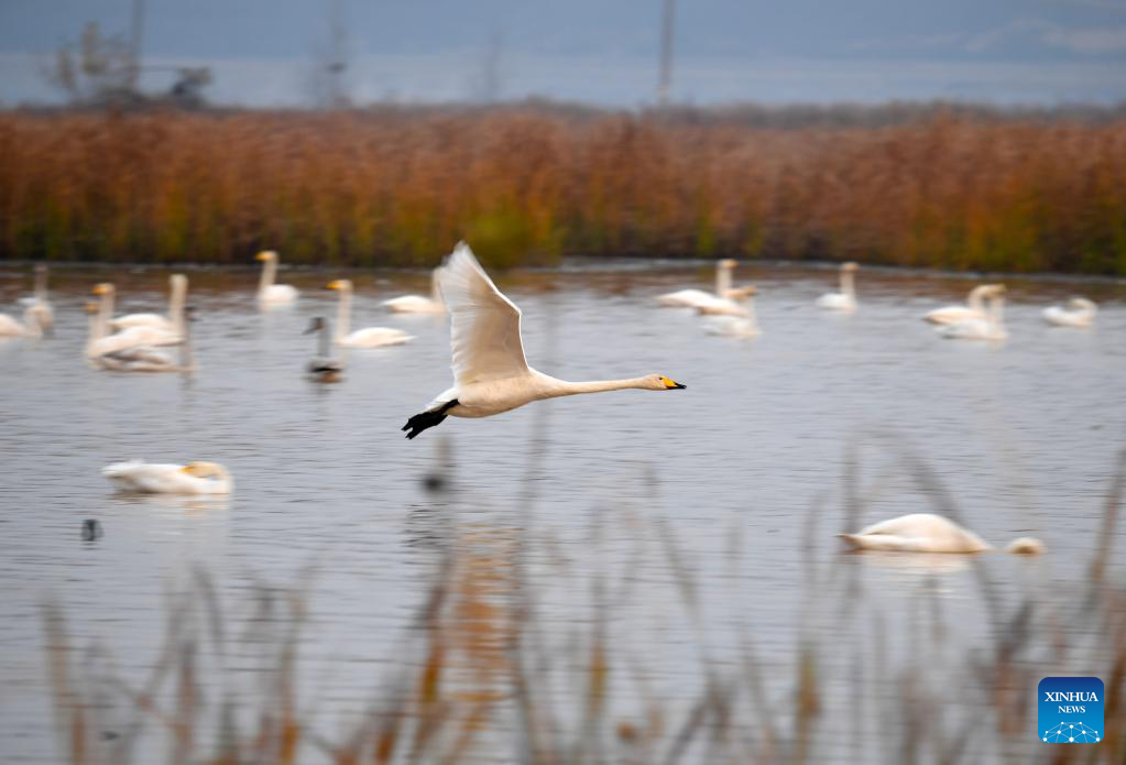A swan flies over a wetland in Sanmenxia, central China's Henan Province, Nov. 23, 2022. A large number of migratory swans flied to the Yellow River wetland in Sanmenxia to spend winter. (Xinhua/Wang Ding)