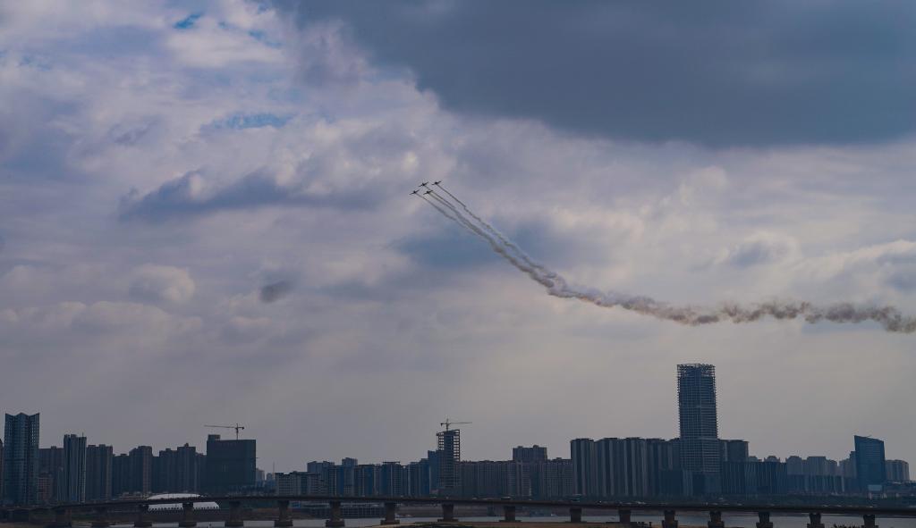 Aircrafts from a South African aerobatics team leave trails of smoke when performing above downtown Nanchang, capital of east China's Jiangxi Province, Nov. 23, 2022. (Xinhua/Wan Xiang)