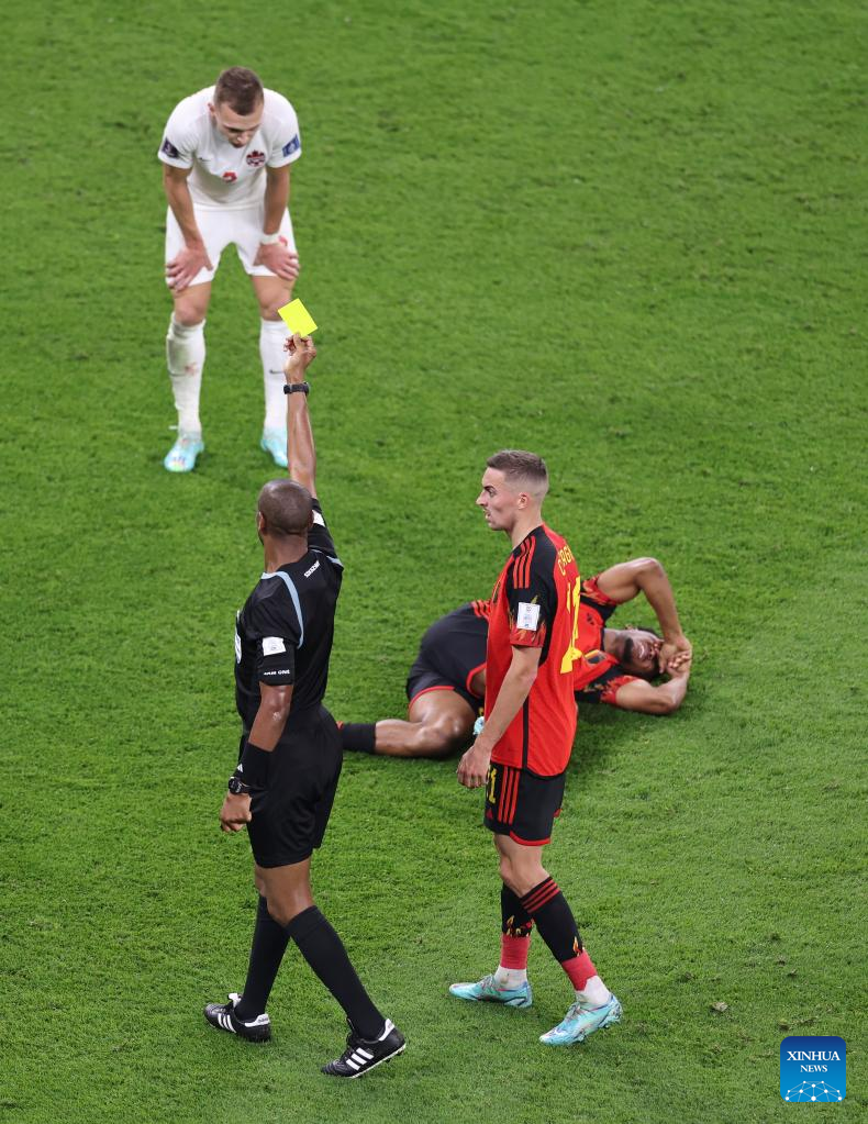 Referee Janny Sikazwe (front L) gives a yellow card to Alistair Johnston (top) of Canada during the Group F match between Belgium and Canada at the 2022 FIFA World Cup at Ahmad Bin Ali Stadium in Al Rayyan, Qatar, Nov. 23, 2022. (Xinhua/Xu Zijian)