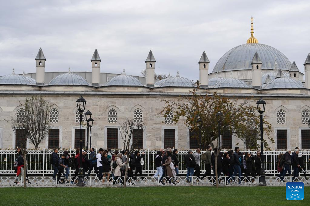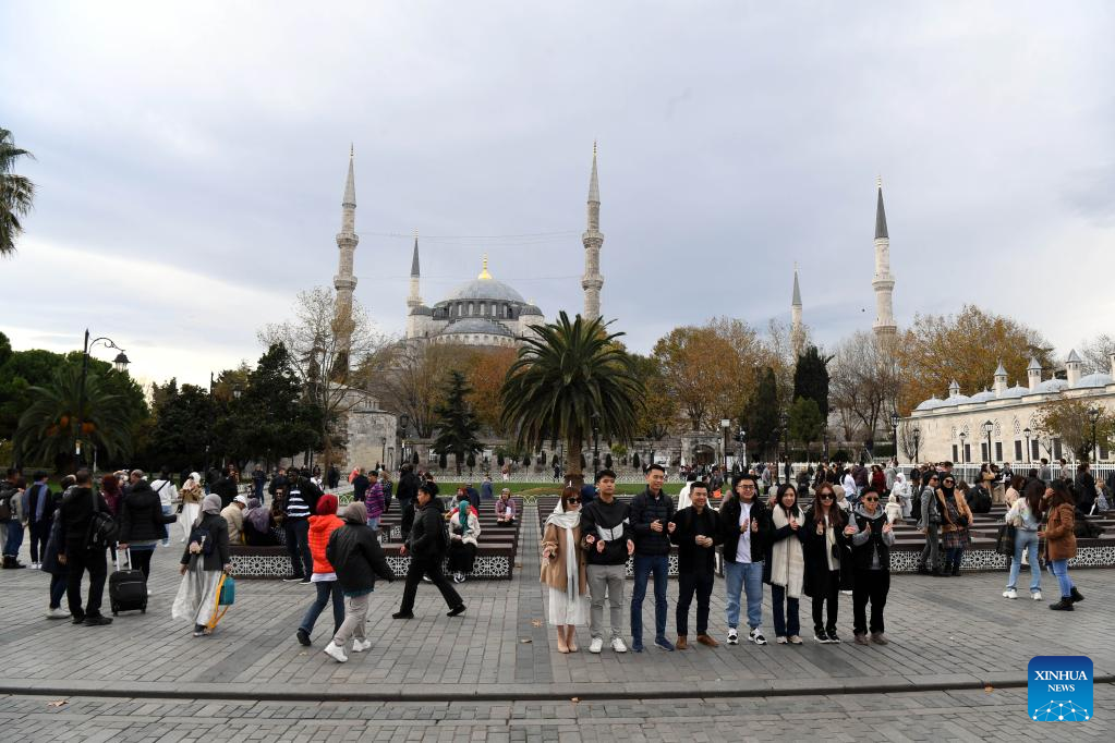 Tourists are seen near Sultanahmet Square in Istanbul, Trkiye, Nov. 23, 2022. More than 4.8 million foreign visitor arrivals were registered in Trkiye in October, up by 38.3 percent year on year, official statistics showed on Monday. (Xinhua/Shadati)