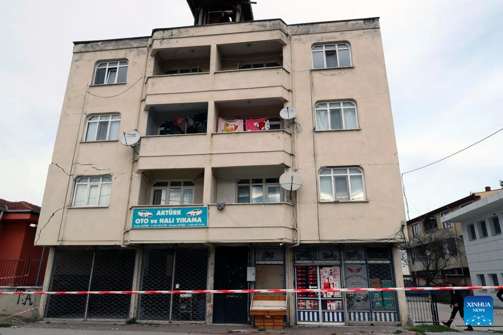 A building is damaged by an earthquake in Duzce, Trkiye, Nov. 23, 2022. At least 50 people were injured after a magnitude 5.9 earthquake struck Trkiye's northwestern province of Duzce early Wednesday. (Photo by Mustafa Kaya/Xinhua)
