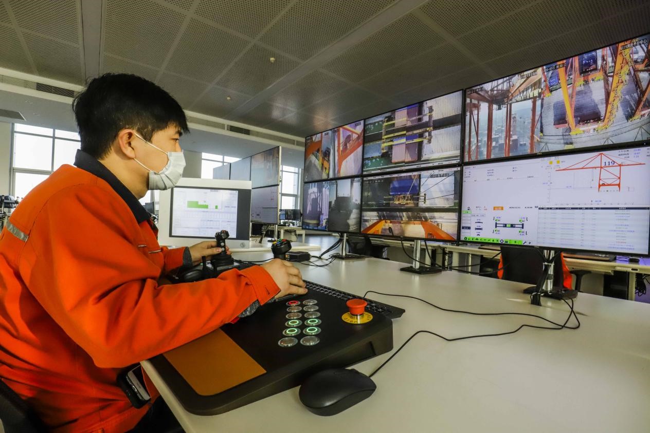 A worker controls terminal devices from an intelligent control center of the Tangshan Port, north China's Hebei province, Dec. 11, 2020. (People's Daily Online/Liu Mancang)