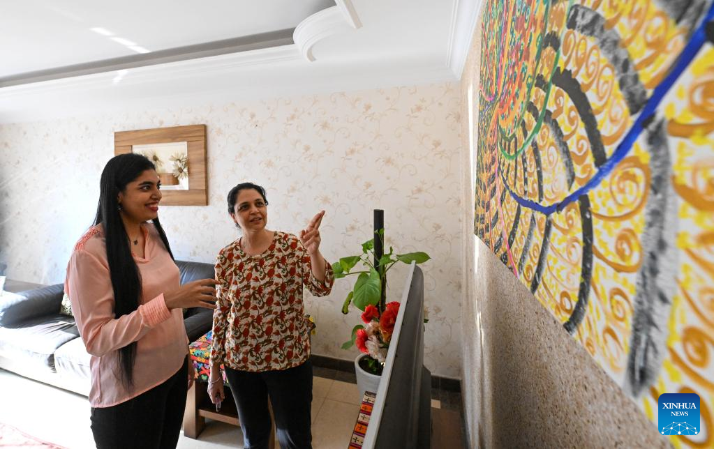 Gurmehar Singh and her mother talk about one of her paintings at her home in north China's Tianjin, Nov. 22, 2022. (Xinhua/Sun Fanyue)